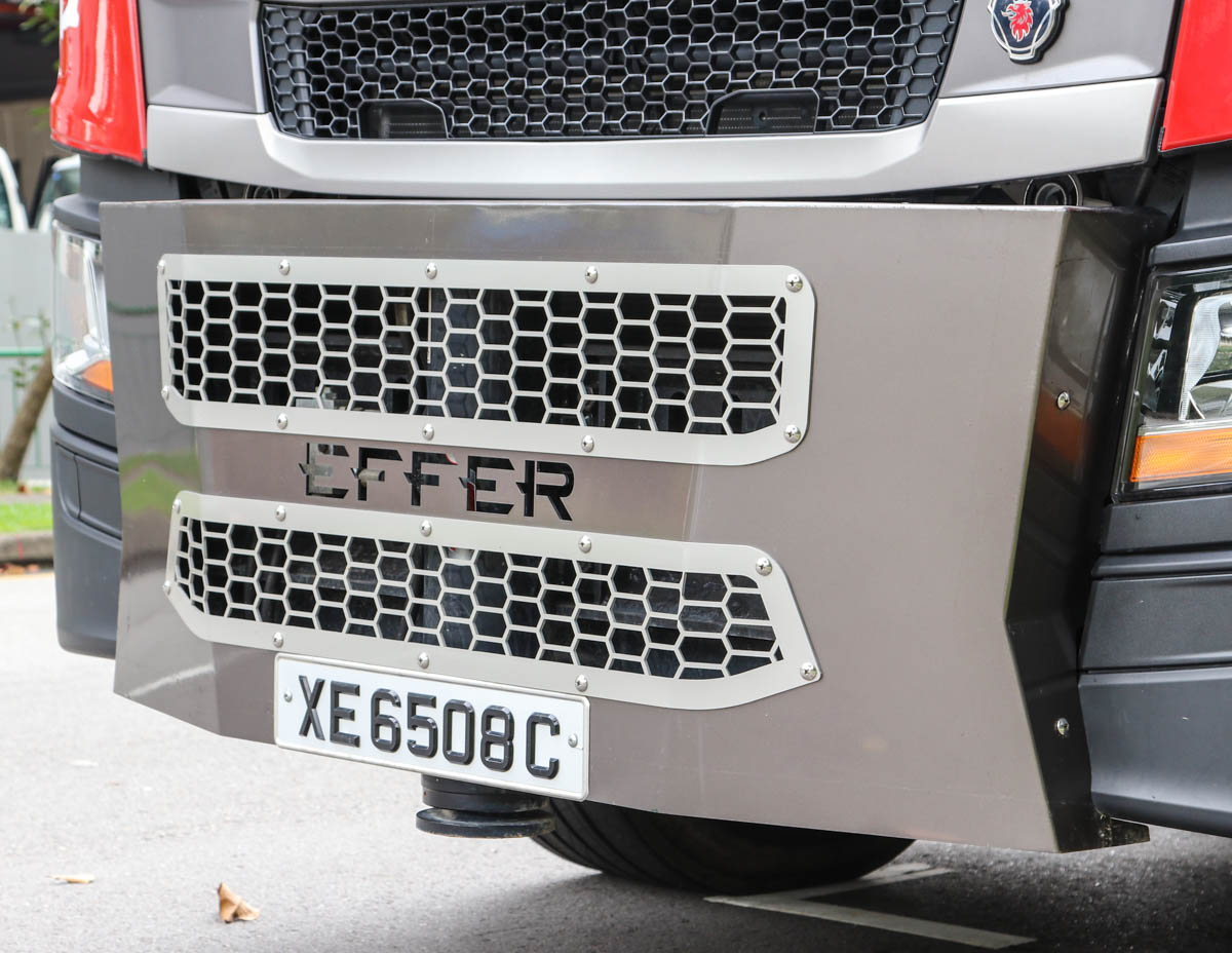 The vehicle is powered by a Scania DC13, a 13-litre 6-cylinder diesel engine with an output of 331 kW (450 hp). The vehicle features an 8x4 drive configuration, with both rear axles driven and both front axles steerable.