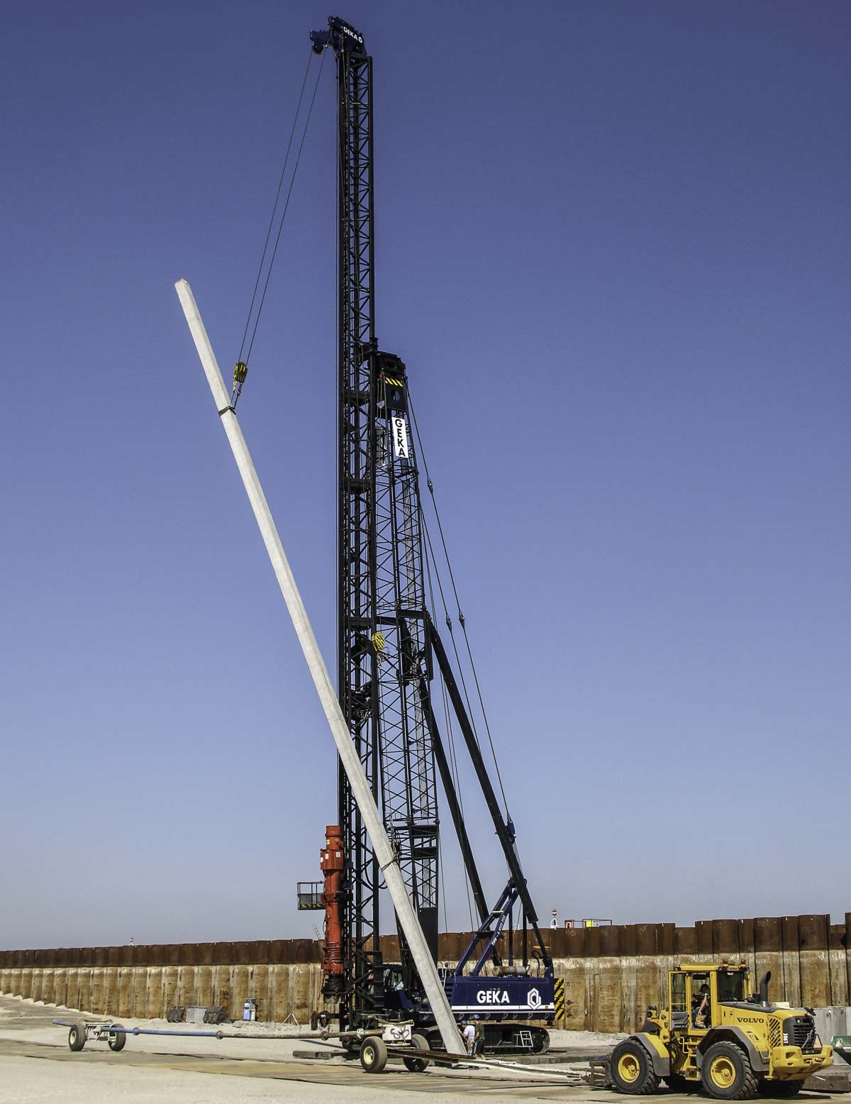 De heipalen zijn maximaal 38 meter lang en 50 centimeter in het vierkant. De heistelling kan de heipalen van 23 ton zelf met twee 15-tons hijslieren vanuit horizontale positie in verticale postitie brengen en onder de heihamer plaatsen.