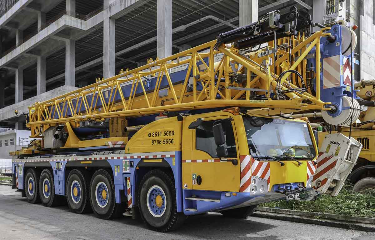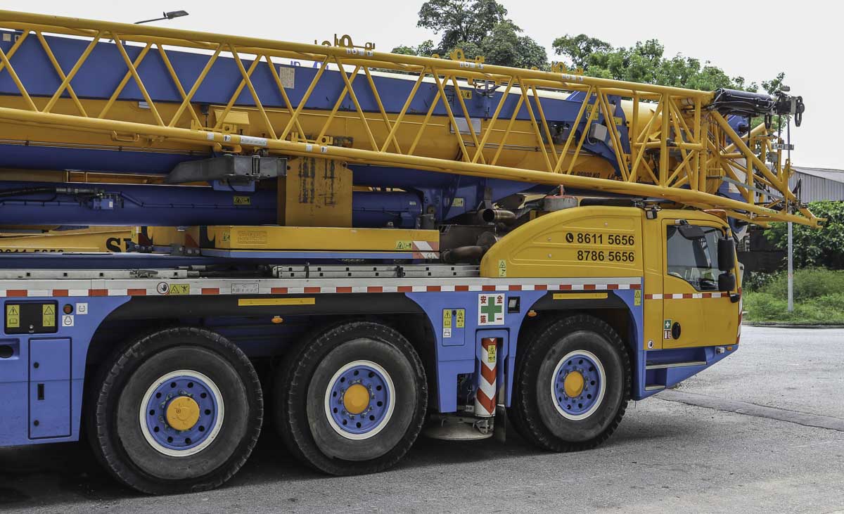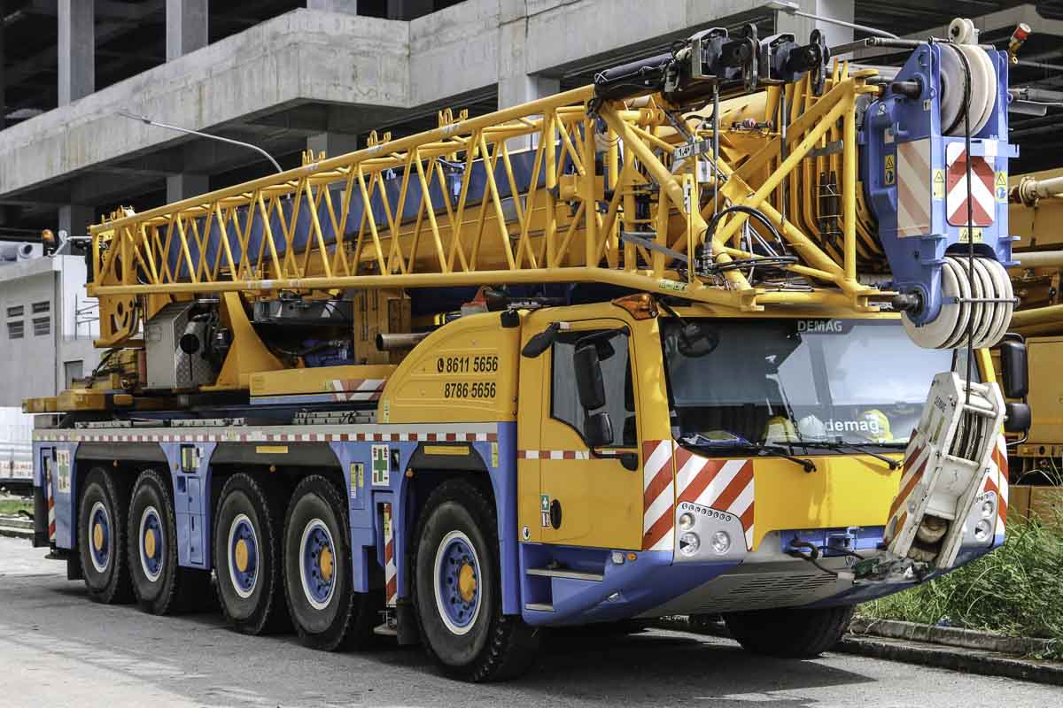 Deze fraaie Demag AC 220-5 is van Sin Demag uit Singapore (SG). Het is een 220-tons kraan gemonteerd op een 5-assige onderwagen. Tijdens het weekend stond de kraan langs de weg in een industrieel gebied geparkeerd. Gebasseerd op de kleuren gaat het om een oude kraan van Huationg (Asia).