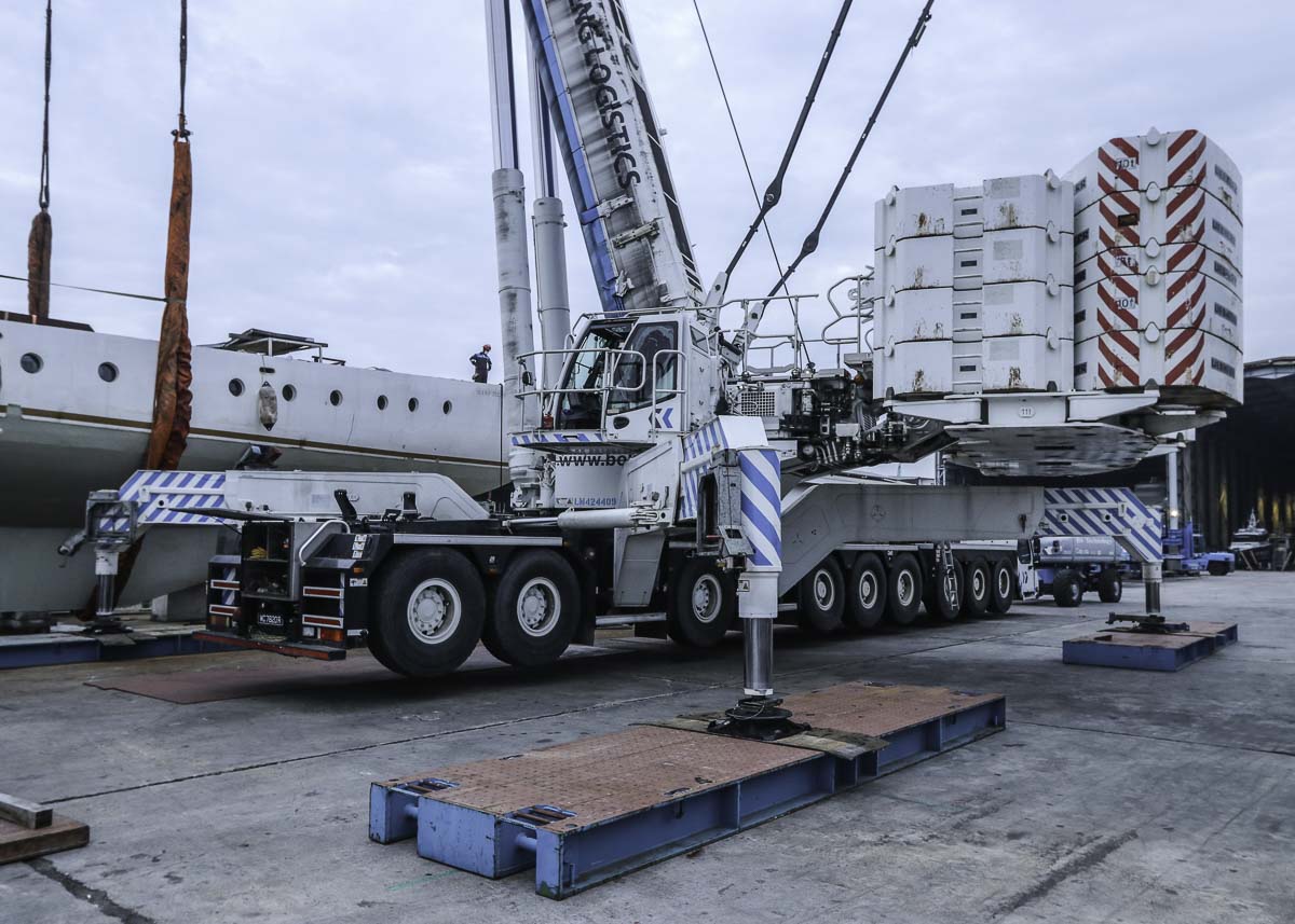 Op een vroege ochtend staan de Liebherr LTM 1500-8.1 en Liebherr LTM 1750-9.1 beide van Bok Seng uit Singapore (SG) gereed om een groot jacht in het water te hijsen.