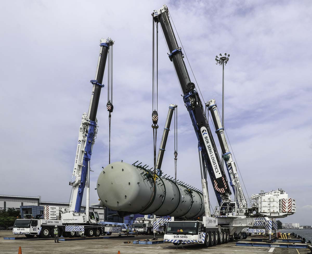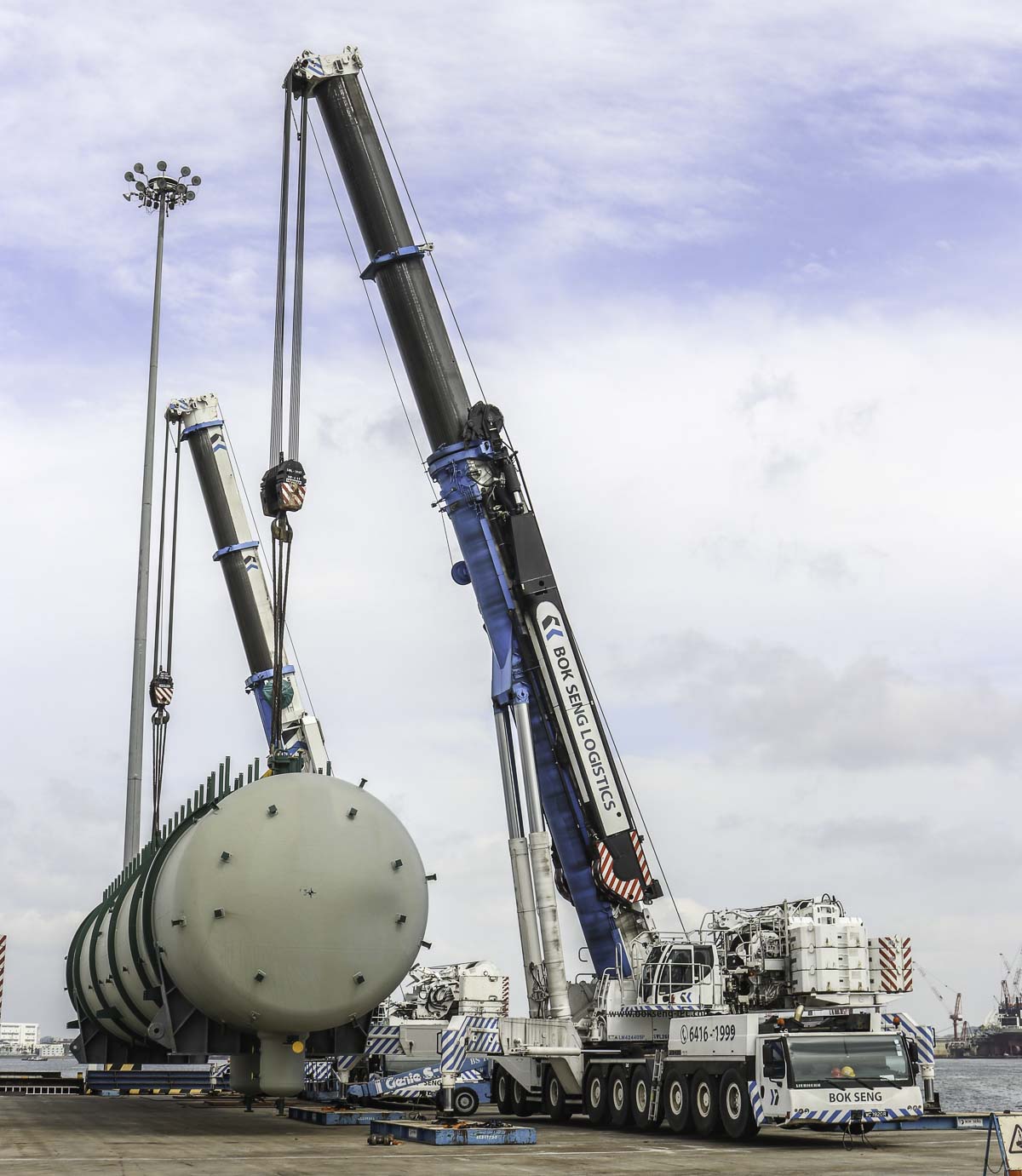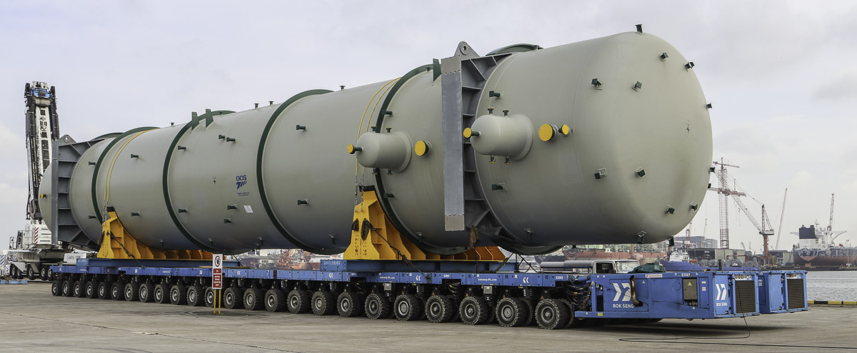 Deze overmaatse kolom werd vanuit Italie naar Singapore gevaren. Vanwege de afmetingen werd de kolom 90 graden gedraaid vervoerd, na aankomst op een haventerrein nabij de bouwplaats in Singapore moet de kolom weer rechtop gezet worden. Een fraaie klus voor de professionals van Bok Seng!