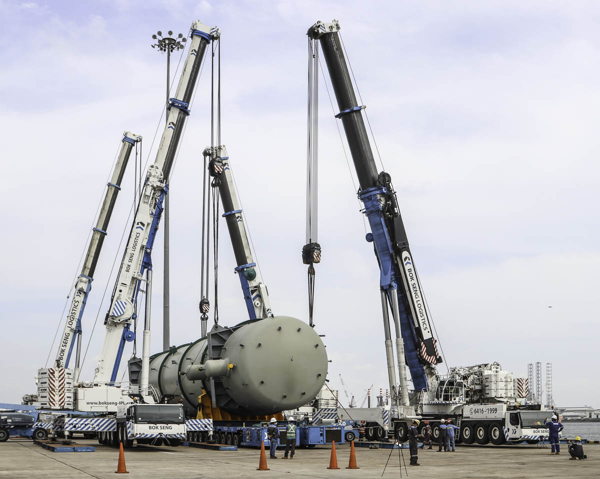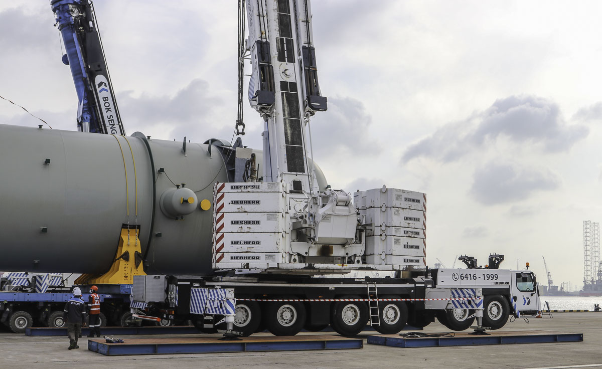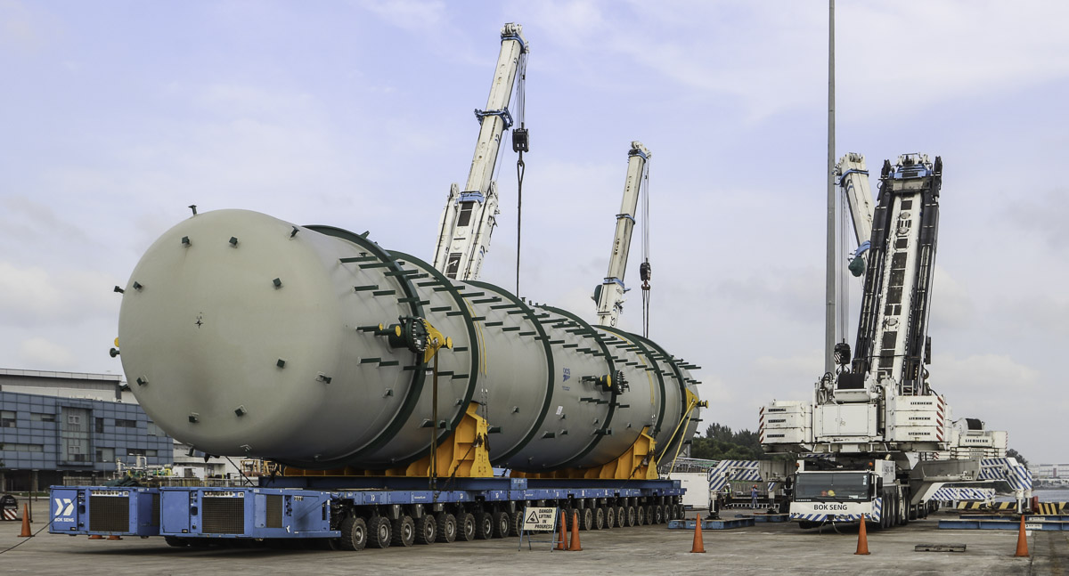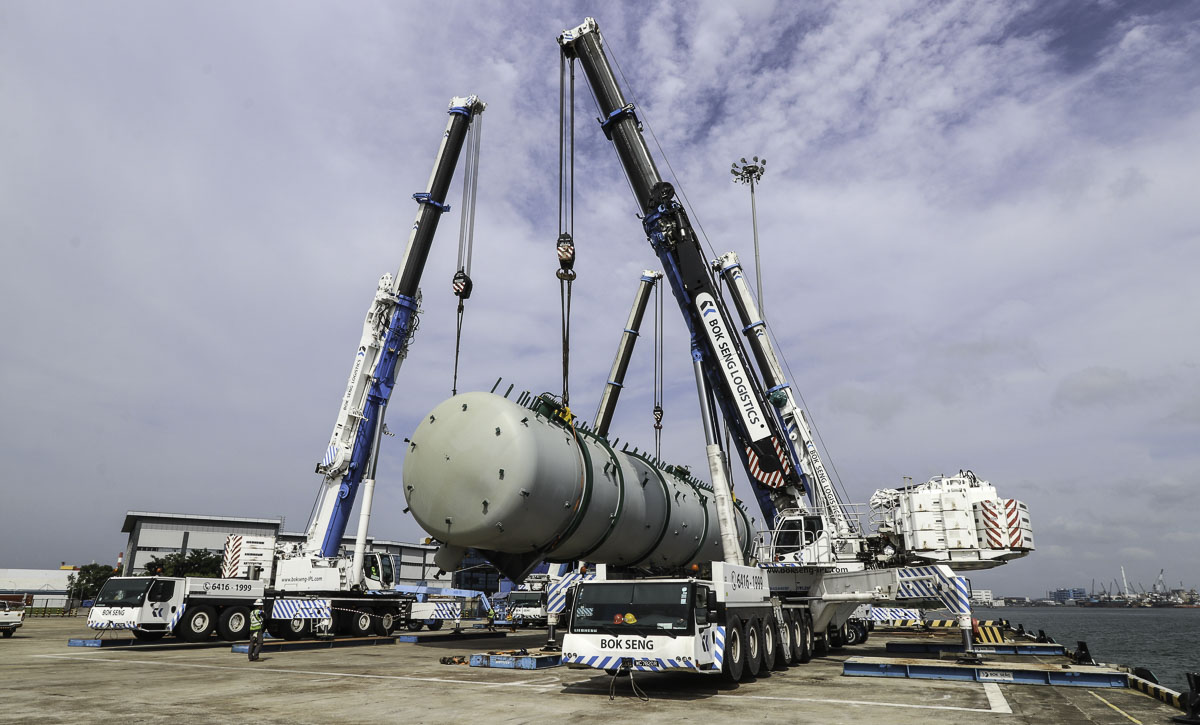 Deze overmaatse kolom werd vanuit Italie naar Singapore gevaren. Vanwege de afmetingen werd de kolom 90 graden gedraaid vervoerd, na aankomst op een haventerrein nabij de bouwplaats in Singapore moet de kolom weer rechtop gezet worden. Een fraaie klus voor de professionals van Bok Seng!
