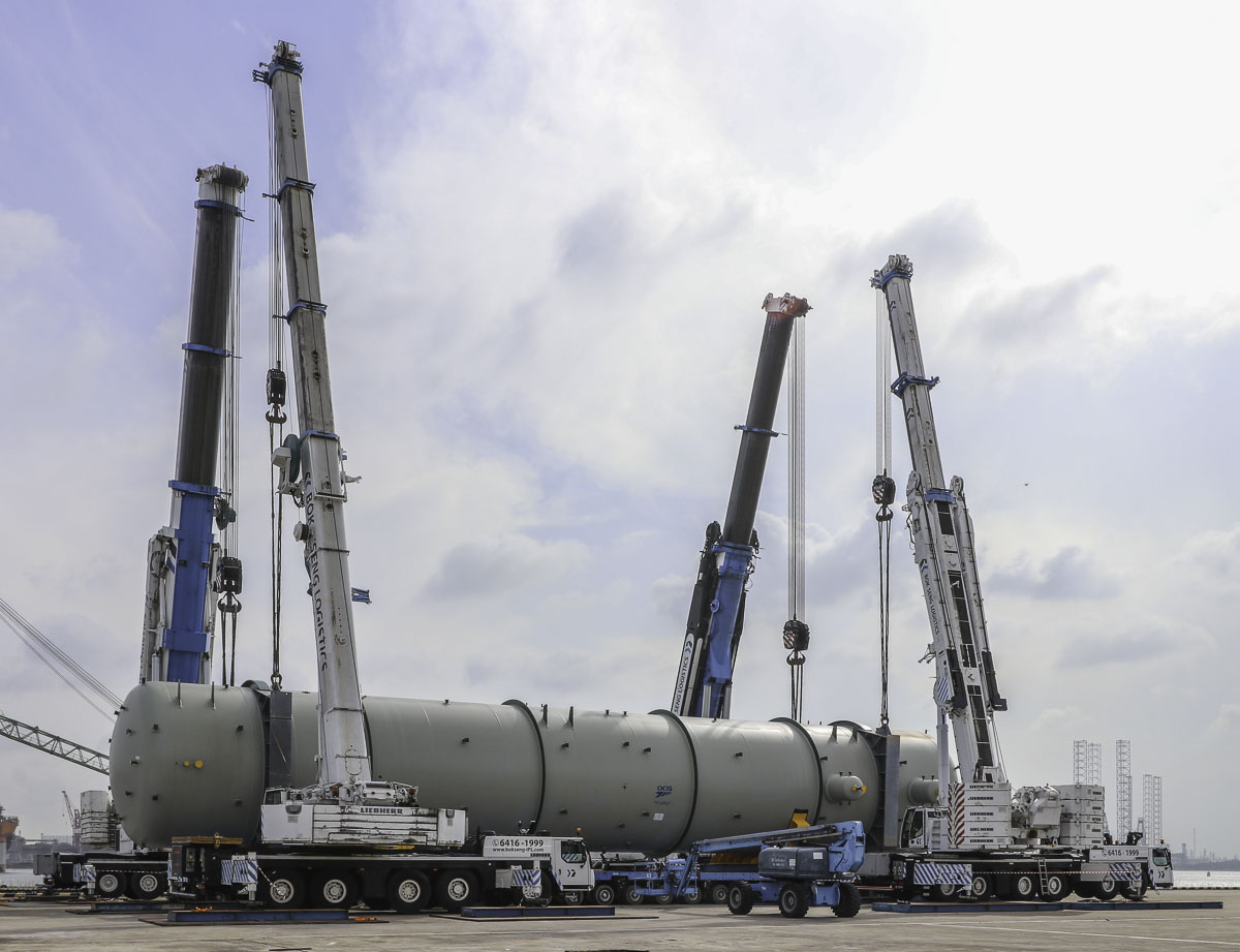 Voor het roteren van de kolom zullen in totaal vier hijskranen gebruikt gaan worden, de SPMT wordt tussen de kranen gereden.