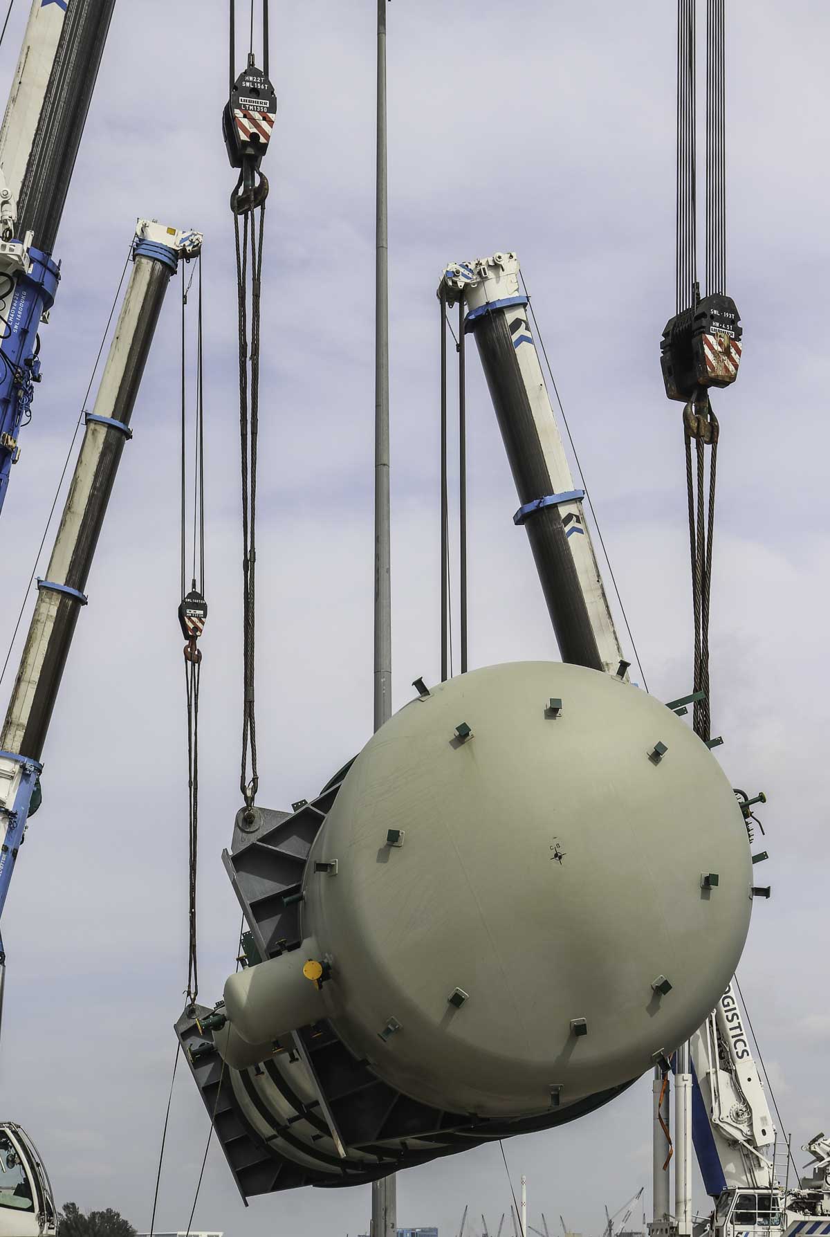 Lanzaam wordt de kolom hier gedraait, goede communicatie en coordinatie tussen de machinisten en hijsmeesters is nu erg belangrijk.