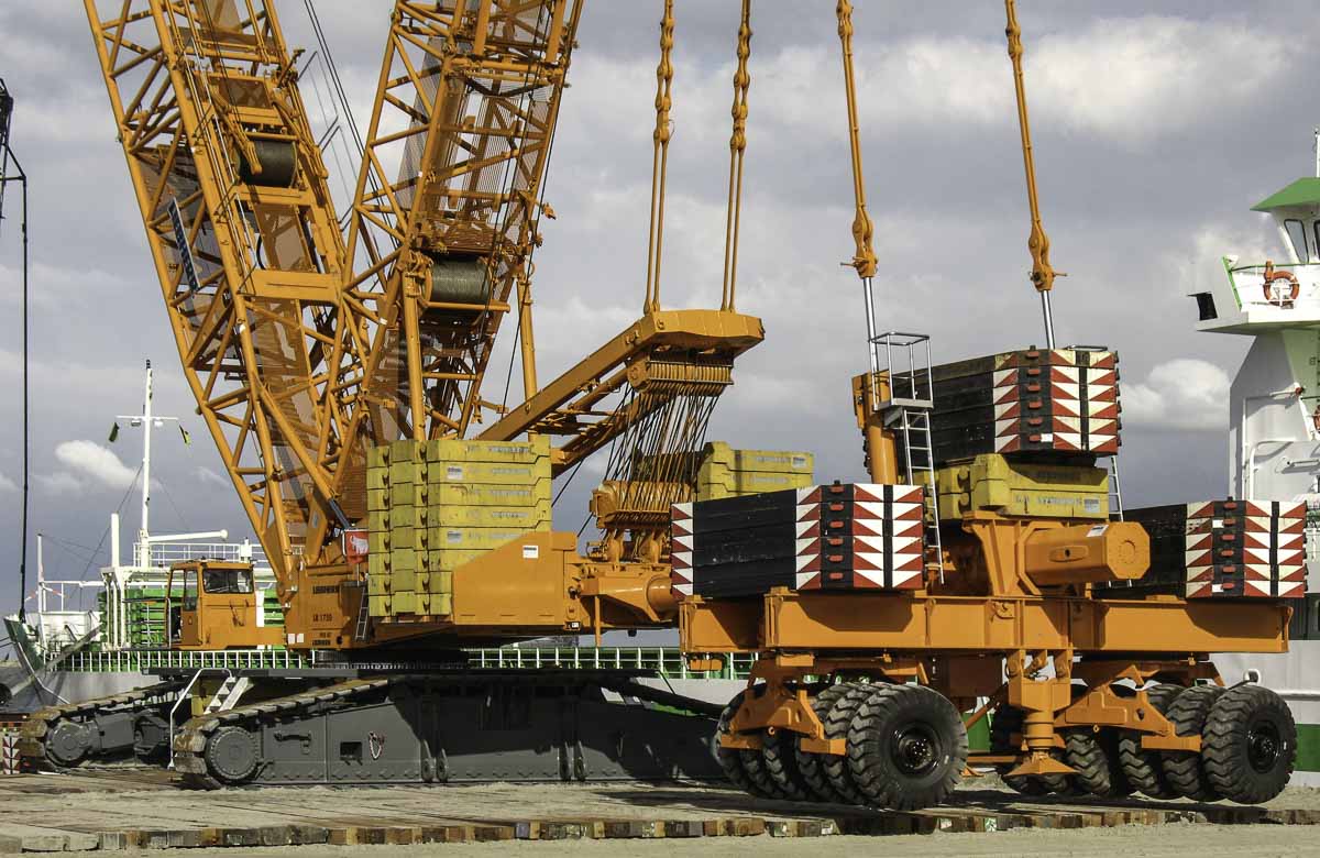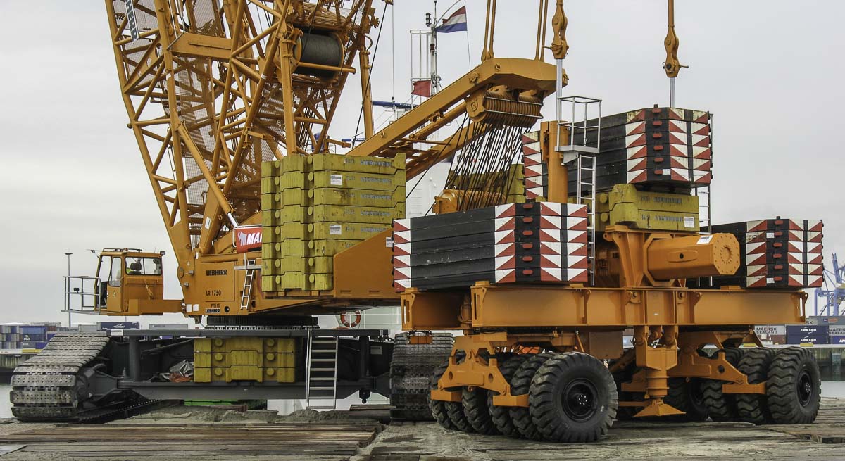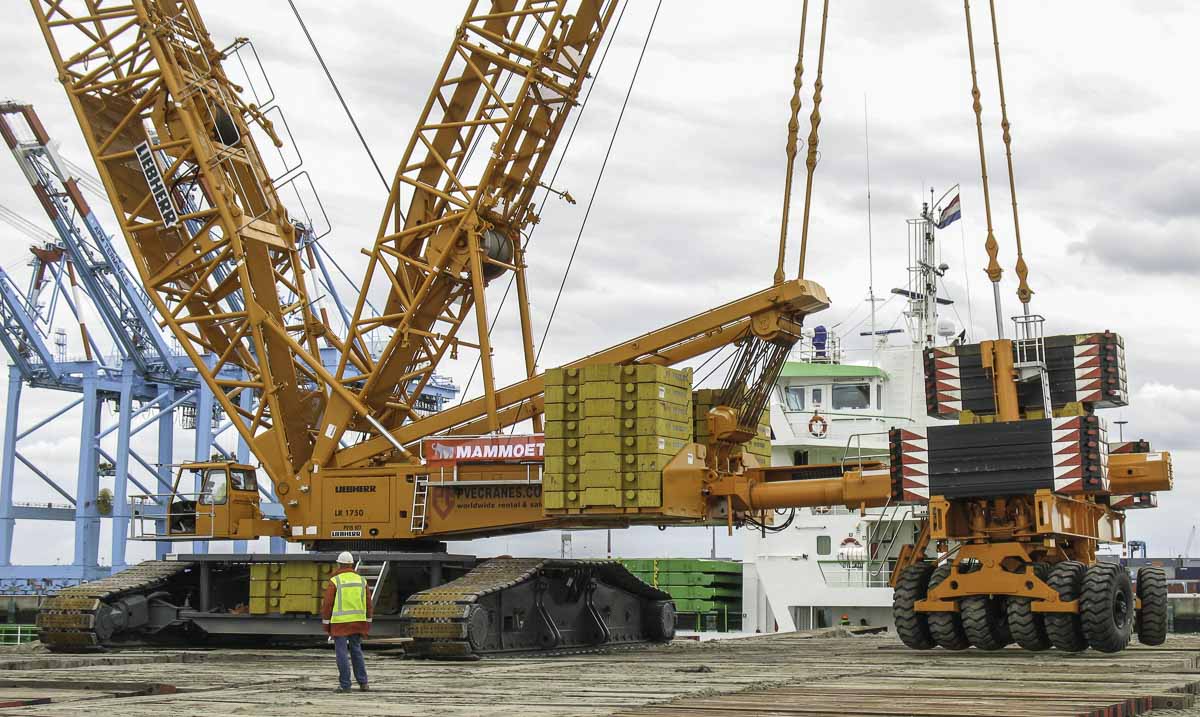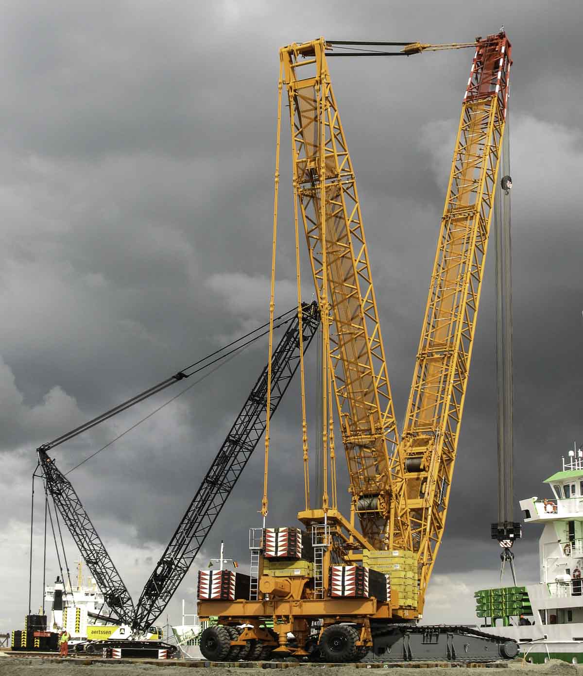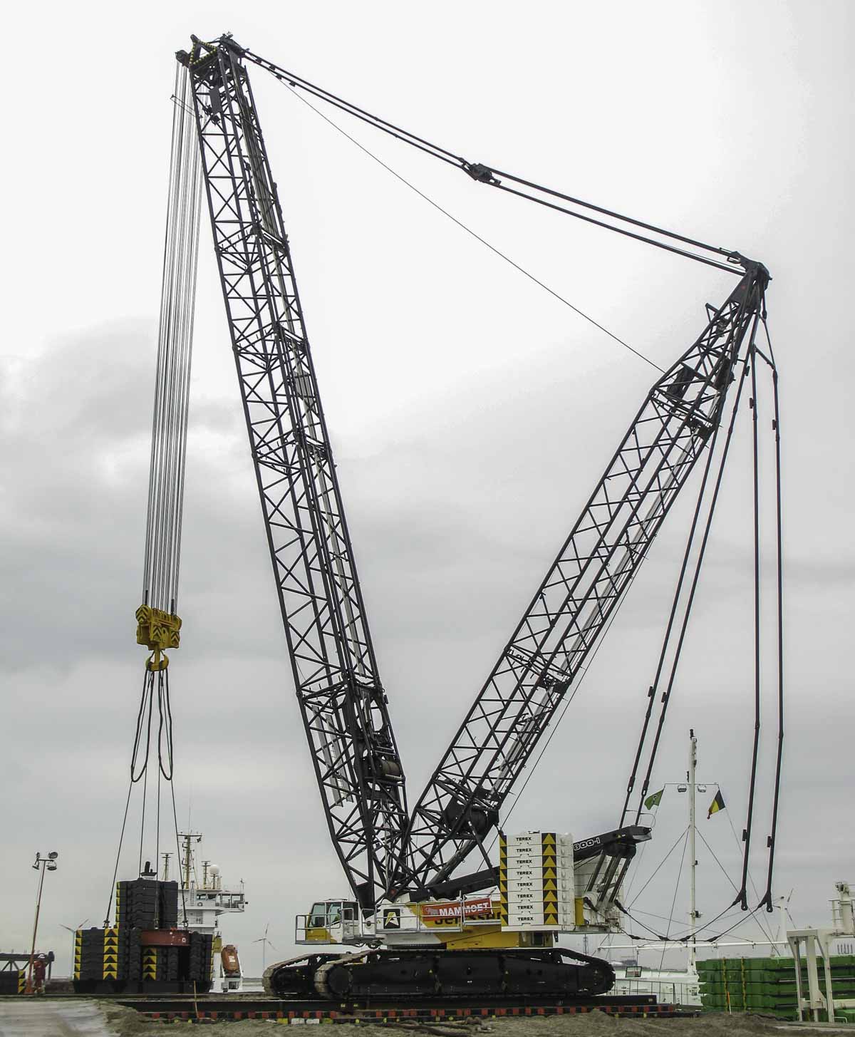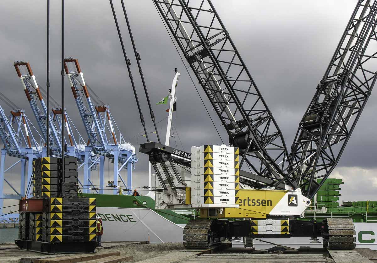 Voor het hijsen van monopiles in de haven van Zeebrugge (BE) zetten Mammoet twee zware rupskranen in. Deze Terex CC 2800-1 werd van Aertssen uit Stabroek (BE) ingehuurd.