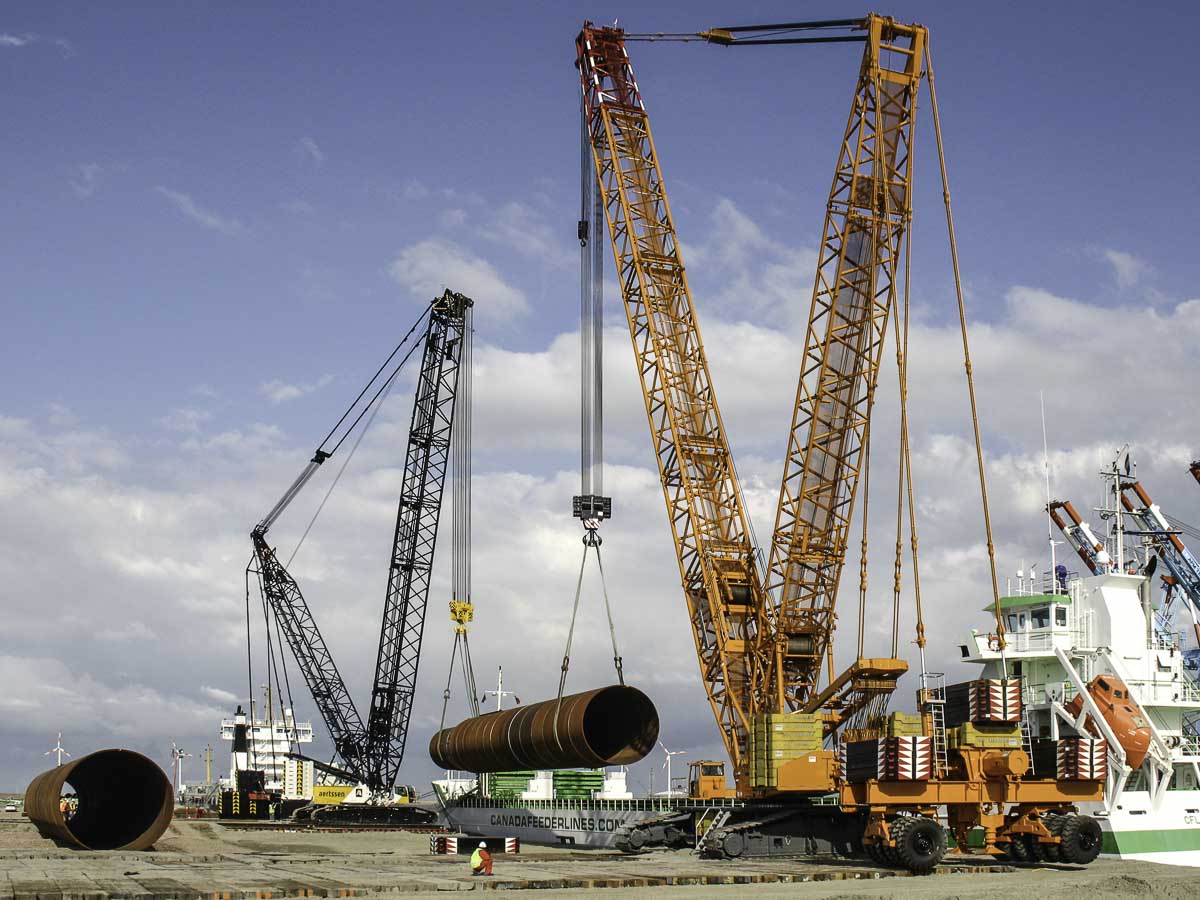 De boot heeft twee grote monopiles (fundatiepalen voor offshore windturbines) geladen die de kranen moeten lossen. De monopiles zullen tijdelijk tussen de kranen opgeslagen worden. De kranen hijsen hier de eerste monopile uit het schip, de superliftballast van de CC 2800-1 zweeft hier zichtbaar in de lucht.
