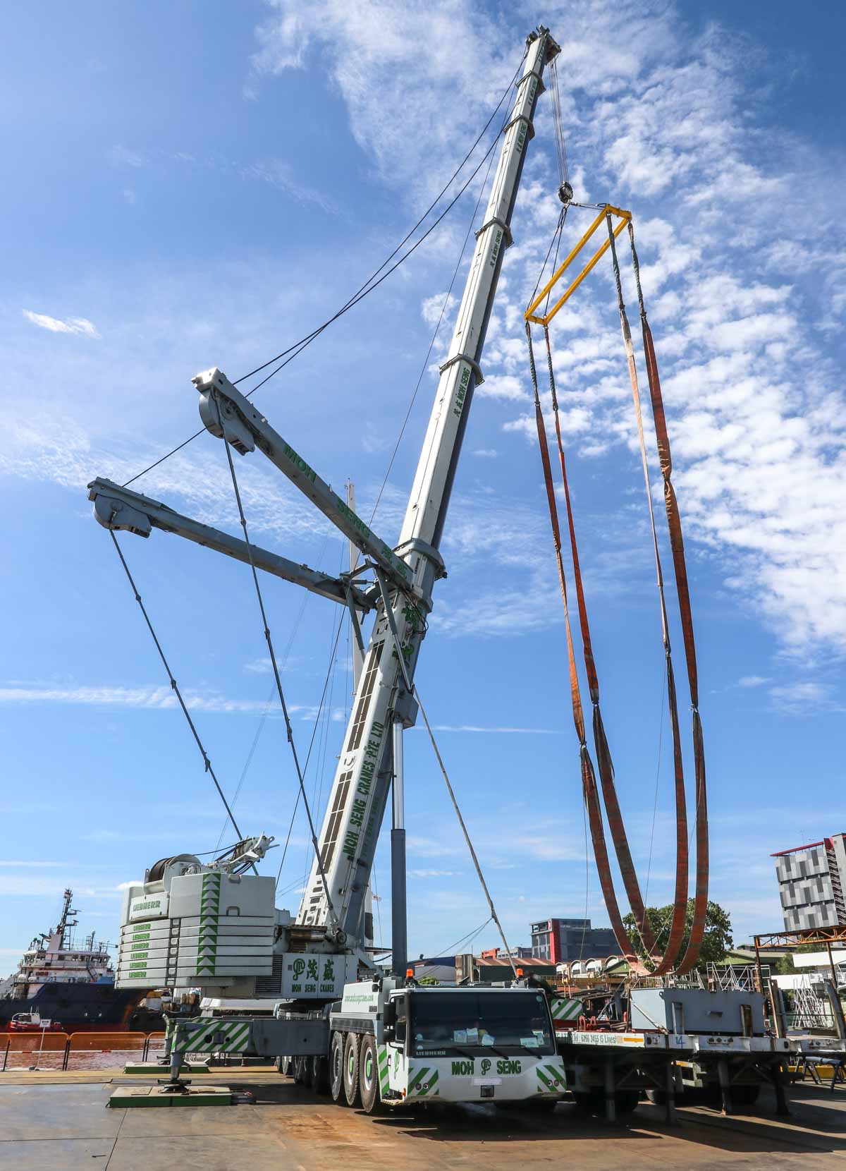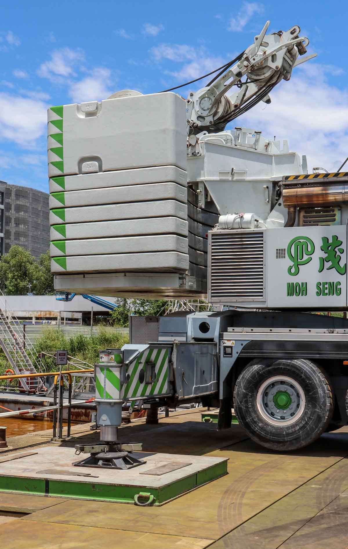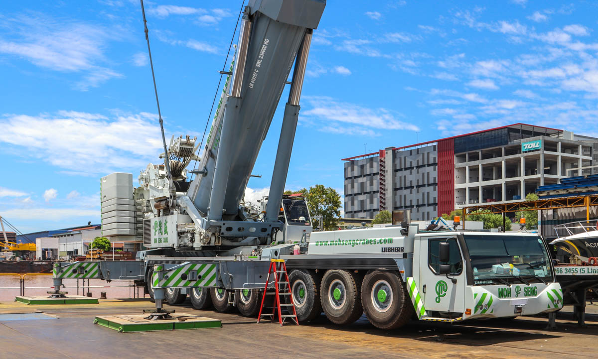 Hier zou de fraaie Liebherr LTM 1500-8.1 van Moh Seng uit Singapore (SG) voor het hijsen van een catamaran ingezet worden.