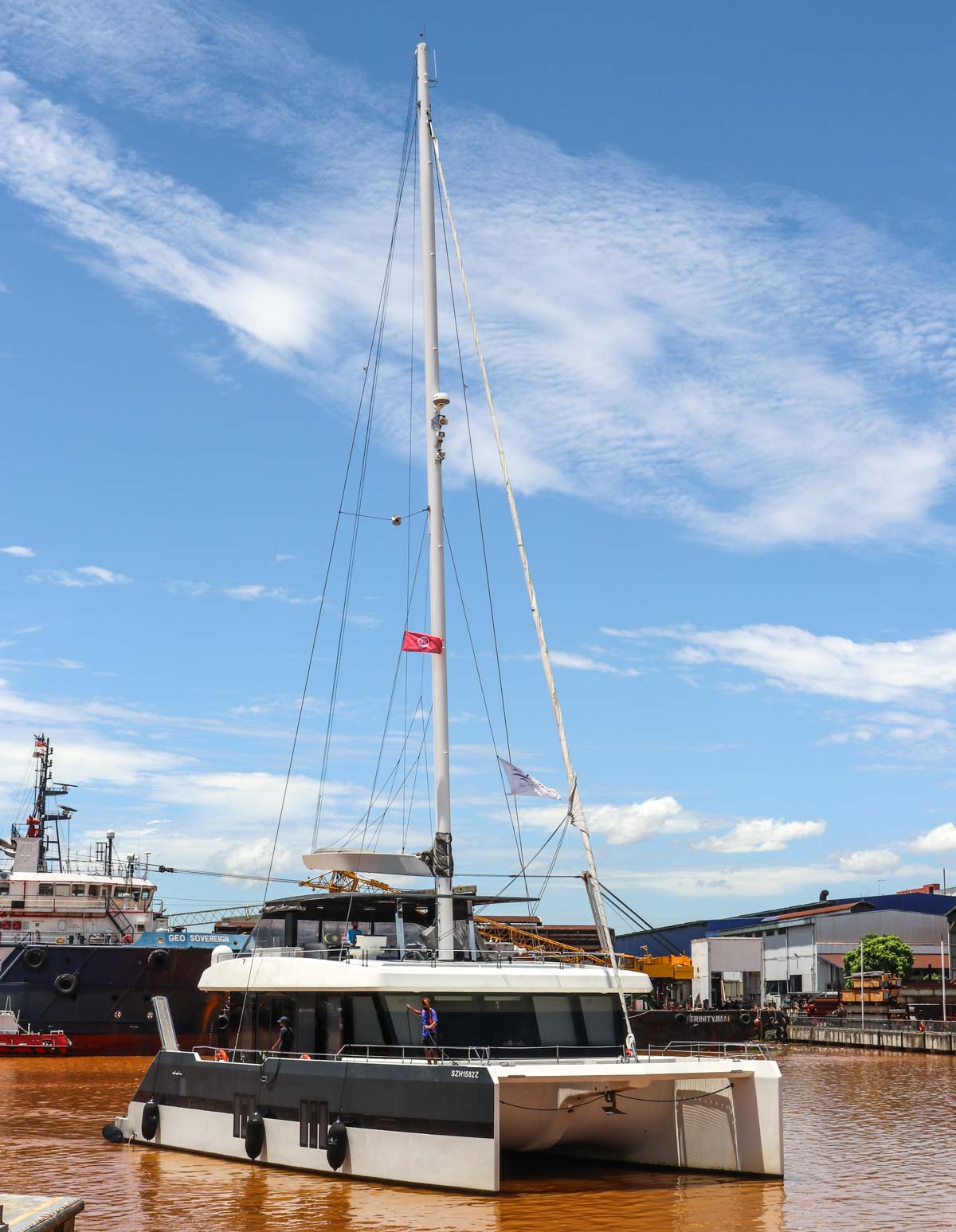 Hier komt de catamaran al aangevaren. De lange zeilmast zal een uitdaging zijn bij het hijsen.