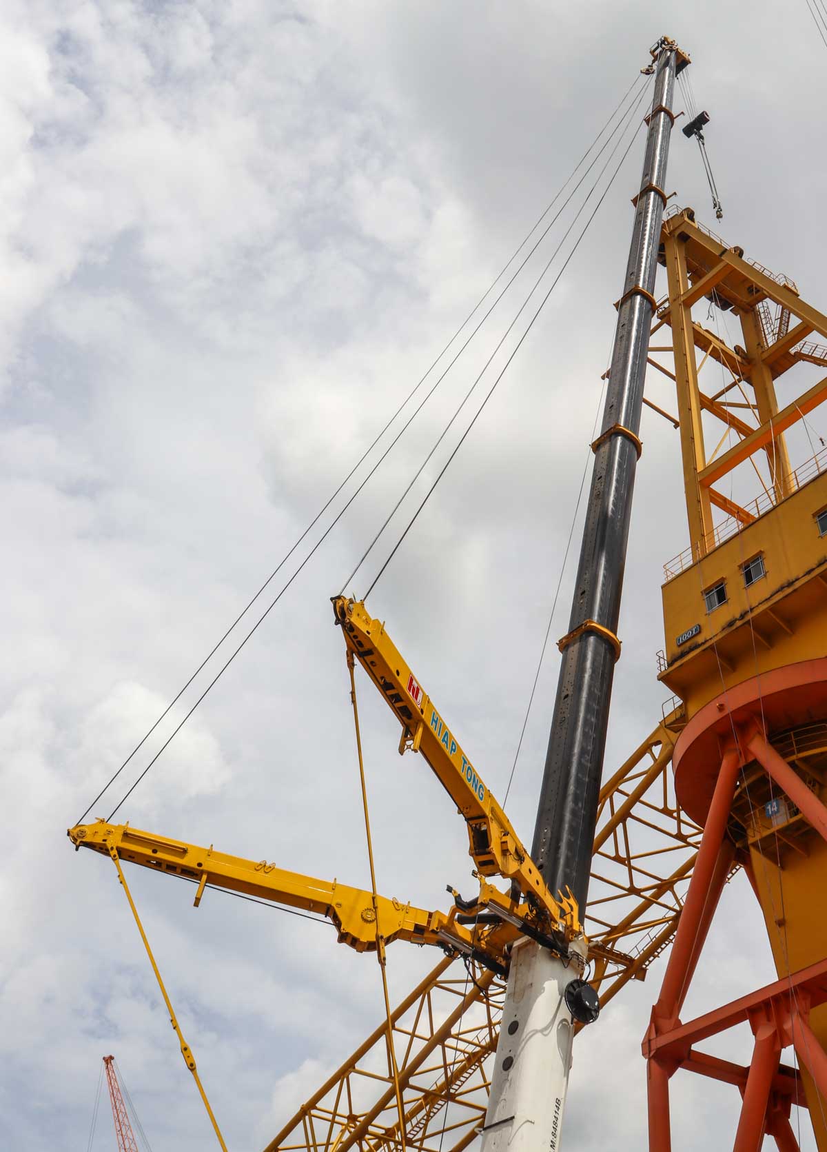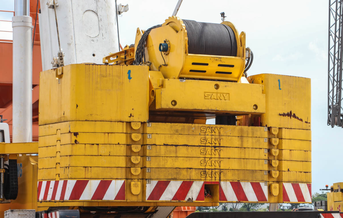 De indrukwekkende Sany SAC6000 van Hiap Tong uit Singapore (SG) werd bij de demontage van meerdere havenkranen ingezet. Het is een 600-tons kraan gemonteerd op een 8-assige onderwagen uit het bouwjaar 2019.
