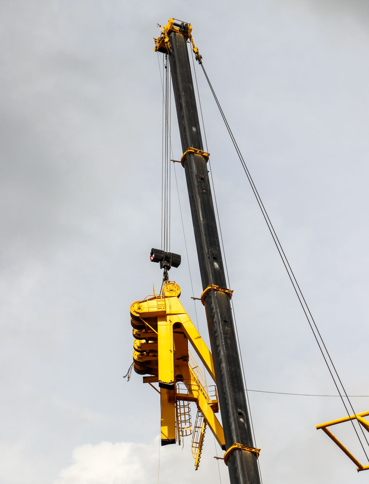 De kraan is met een 13,5-tons hijslier uitgevoerd. Hier werd met een 3-schijfs 80-tons haak met zes inscheringen gewerkt.