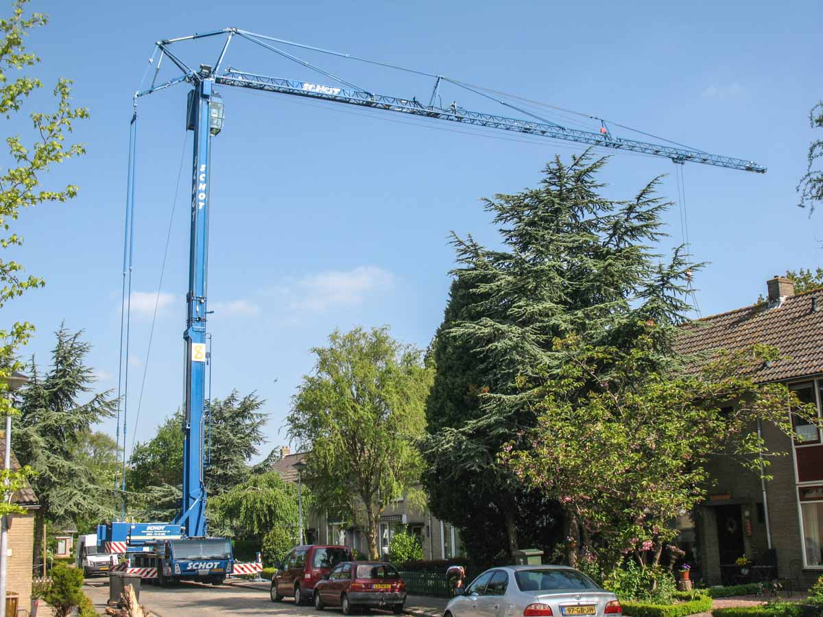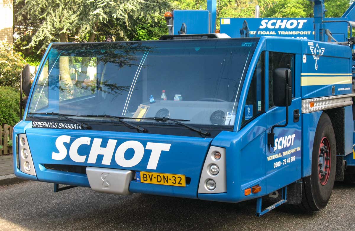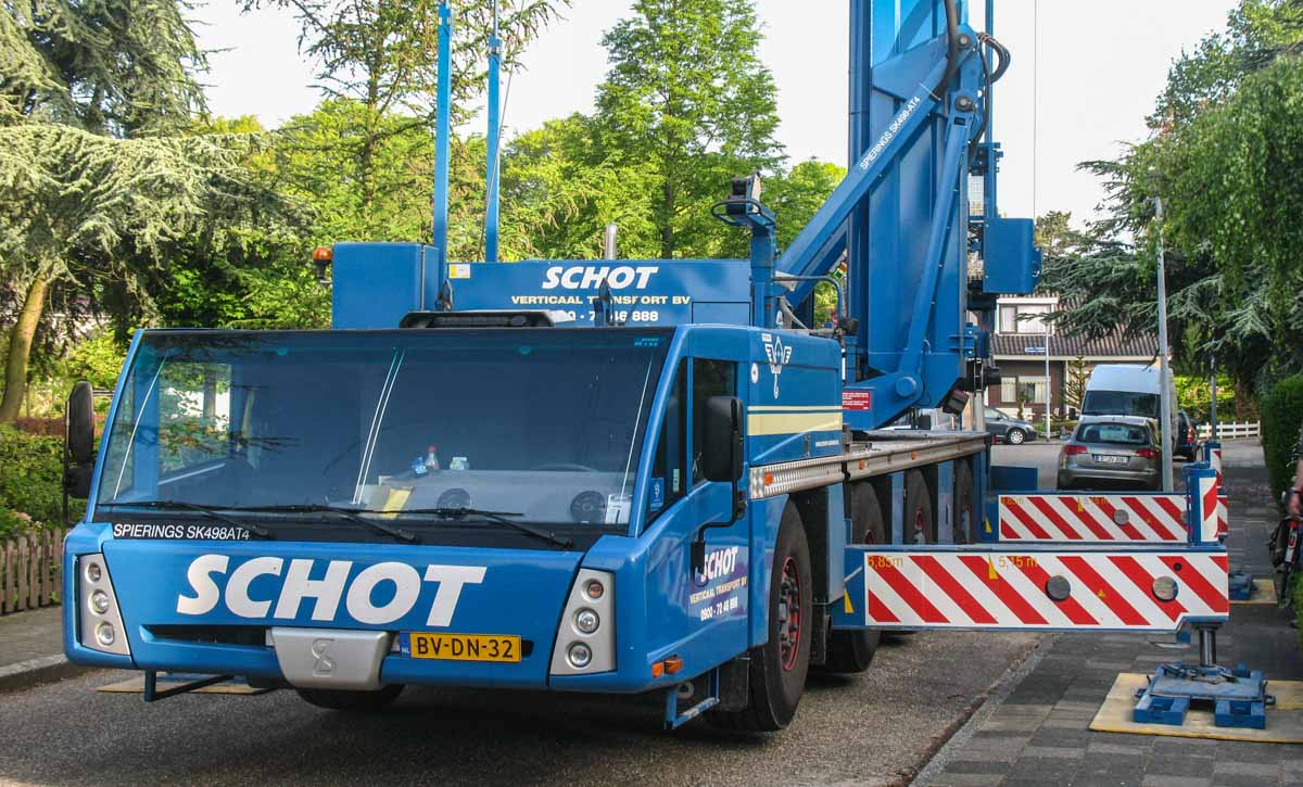 Deze mooie Spierings SK498-AT4 van Schot uit Alkmaar (NL) werd op een zaterdagochtend in Medemblik (NL) ingezet om prefab elementen voor een nieuwe schuur over een gebouw te hijsen.
