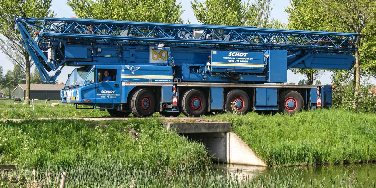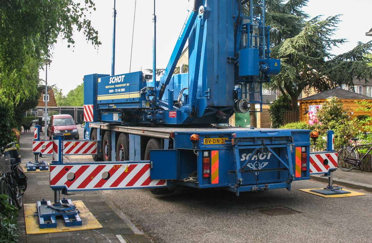 Ingepakt is de kraan 15,98 meter lang, 2,75 meter breed en 4 meter hoog. Het transportgewicht is 48 ton. Met dank aan de machinist voor het poseren van de kraan!