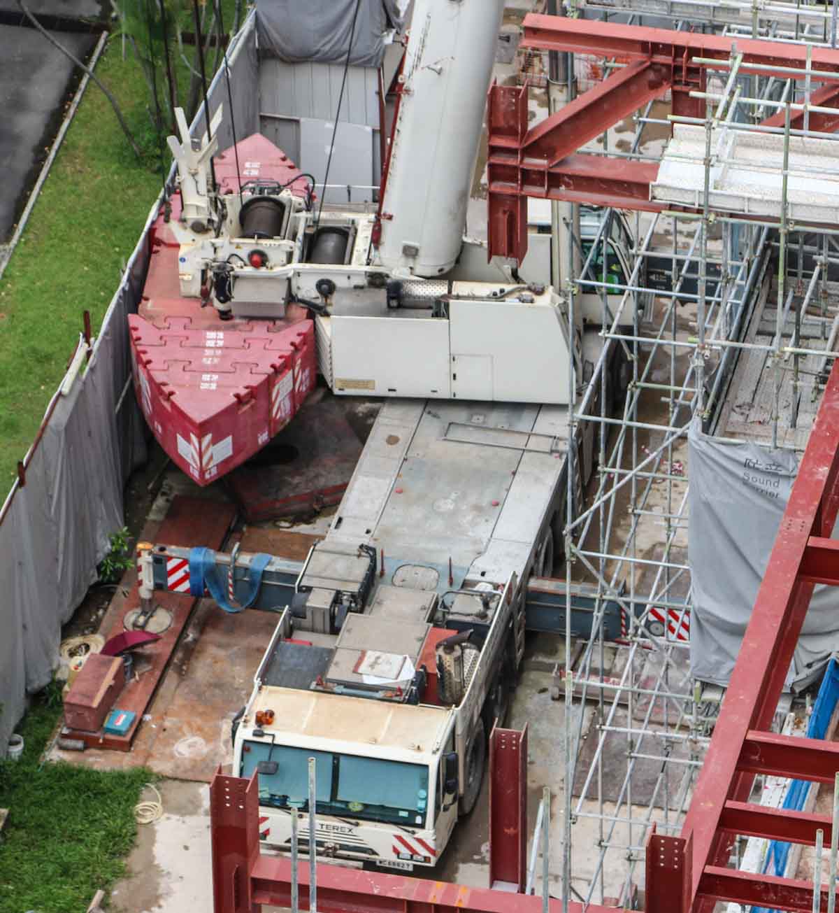 Deze fraaie Terex AC 350/6 van Hup Hin uit Singapore (SG) werd aldaar op een bouwplaats met beweegbare jib ingezet om bouwmaterialen te hijsen. Het is een 350-tons telescoopkraan gemonteerd op een 6-assige onderwagen.