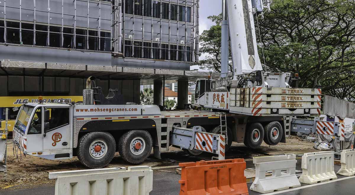 Deze fraaie Terex AC 250-1 van Moh Seng uit Singapore (SG) werd voor de montage van een torenkraan aldaar ingezet. Het is een 250 tons telescoopkraan gemonteerd op een 6-assige onderwagen. Moh Seng zet in totaal twee van deze kranen in.