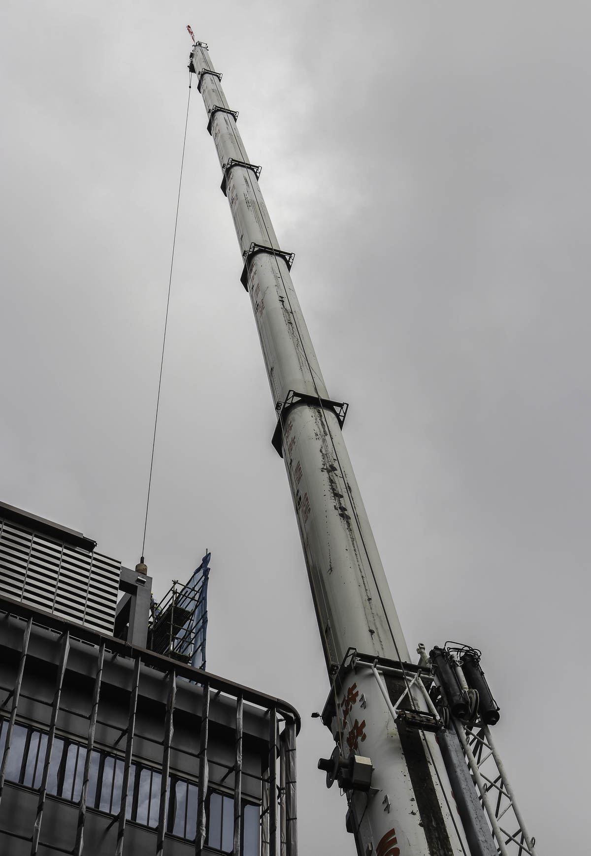 Hier word de 45 meter lange voorgiek van de CTL 340-24 met een gewicht van ongeveer 8 ton opgehesen. De hoofdmast van de AC 250-1 is hier 72,1 meter uitgeschoven, de maximale lengte van de hoofdmast is 80 meter.