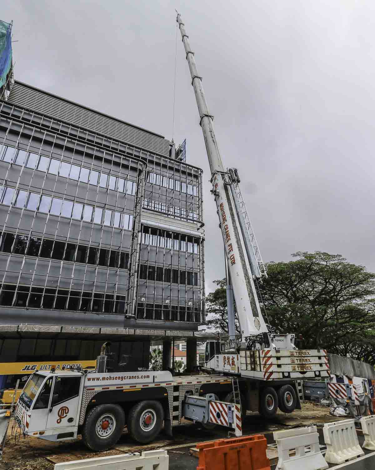 De tweede keer dat ik deze fraaie Terex AC 250-1 van Moh Seng uit Singapore (SG) tegenkwam werd hij bij hetzelfde project ingezet als de bovenstaande foto's. De torenkraan werd na voltooiing van de ruwbouw door een Liebherr LTM 1500-8.1 gedemonteerd. Hier werd de AC 250-1 voor het hijsen van facade elemten ingezet.