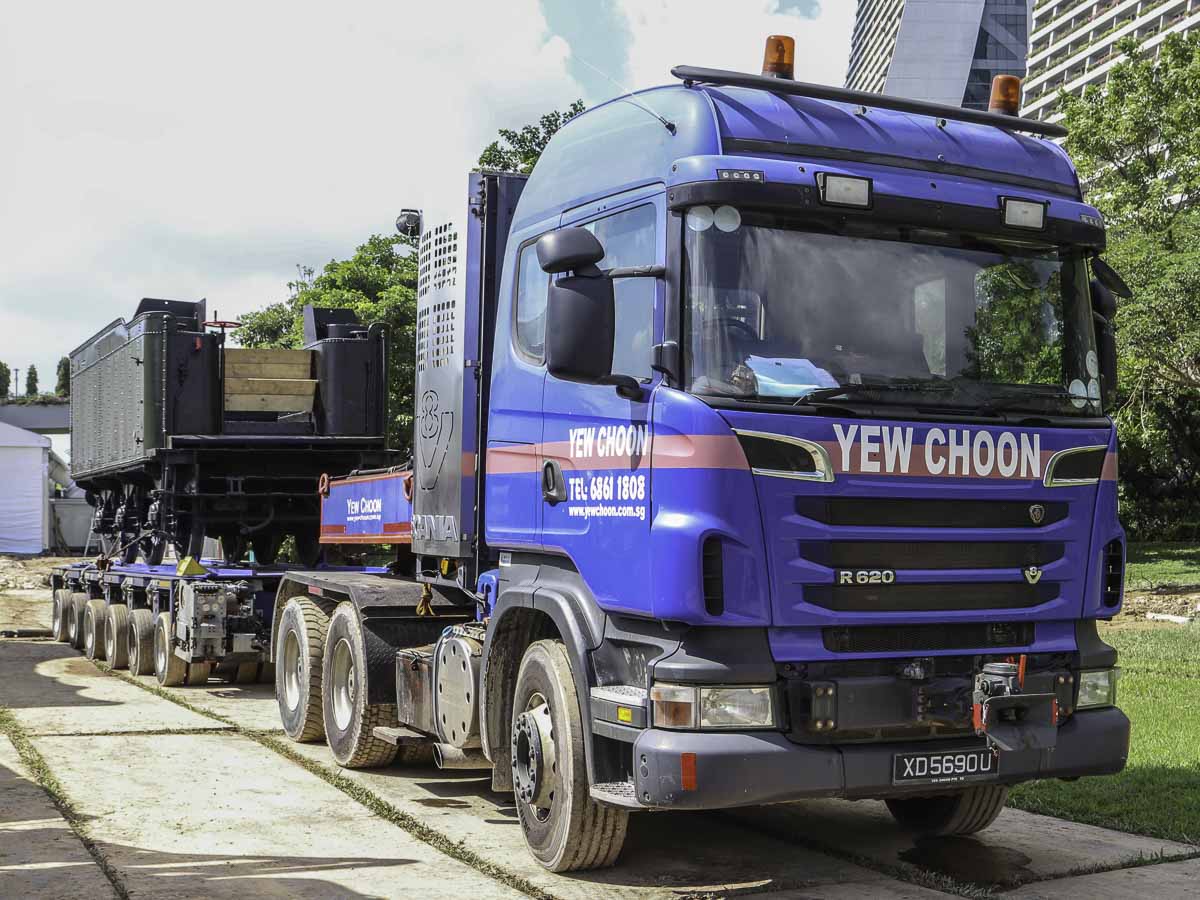 Yew Choon uit Singapore (SG) beschikt over twee Scania R 620 trekkers die vooral voor overmaatse transporten ingezet worden. Deze truck werd met een 12-assige aanhanger ingezet om een oude tank naar de schroothandelaar te brengen.