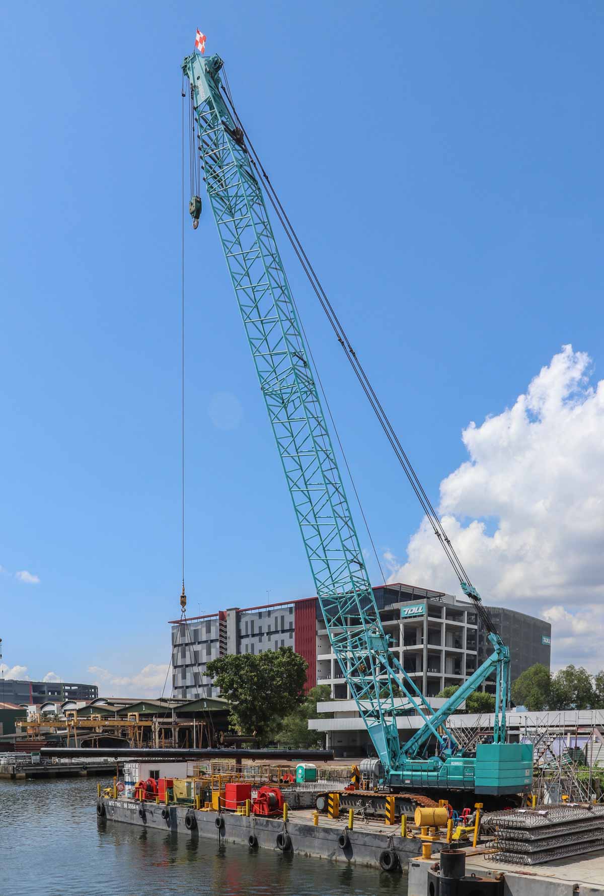 Dieser eindrucksvolle Kobelco 7250S gehört Marina Technology & Construction aus Singapur (SG) und wird hauptsächlich von einem Ponton aus für Arbeiten im Wasser und an Küsten eingesetzt. Es handelt sich um einen 250-Tonnen-Raupenkran aus dem Baujahr 2013.