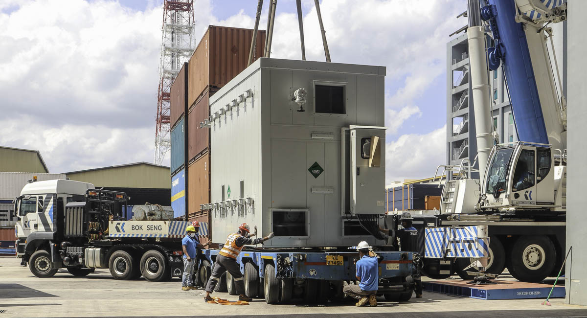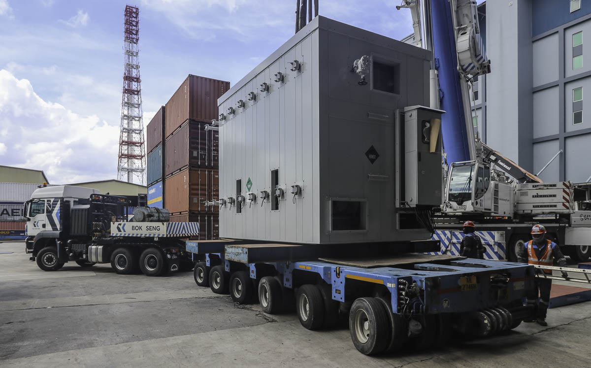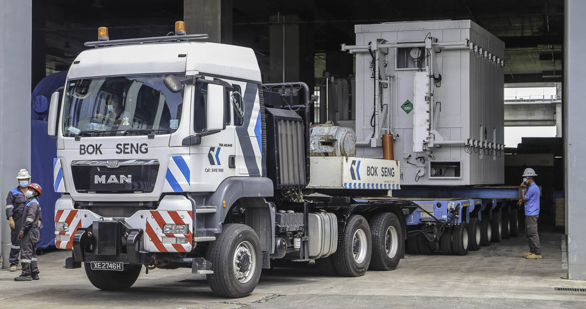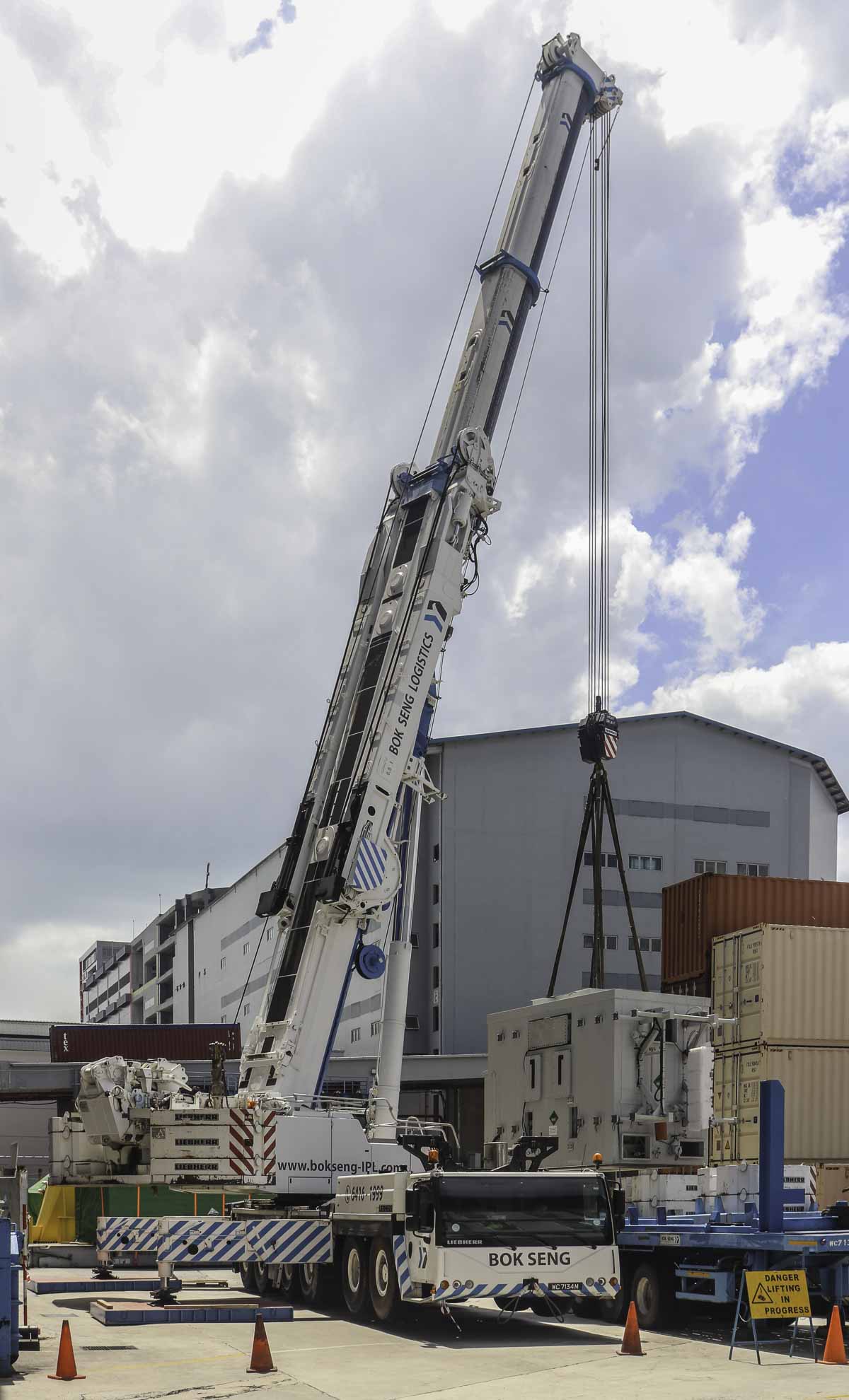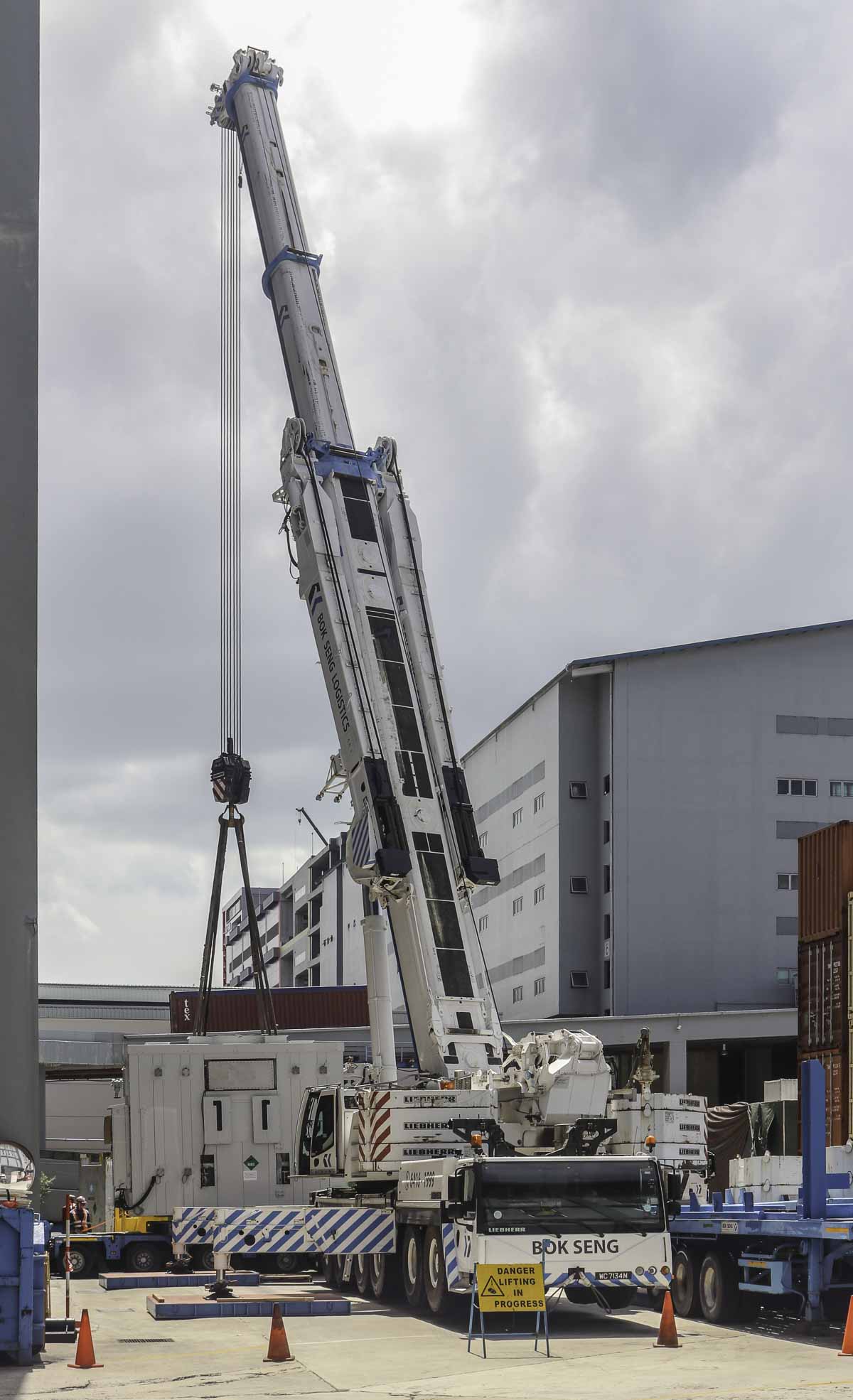Um ein Skid auf dem Gelände von Bok Seng in Singapur (SG) zu heben sollte der Liebherr LTM 1350-6.1 zum Einsatz kommen. Einer der zwei MAN TGS 40.540 Zugmaschinen sollte ein 6-Achser Scheuerle Modulenanhänger mit der Last fahren.