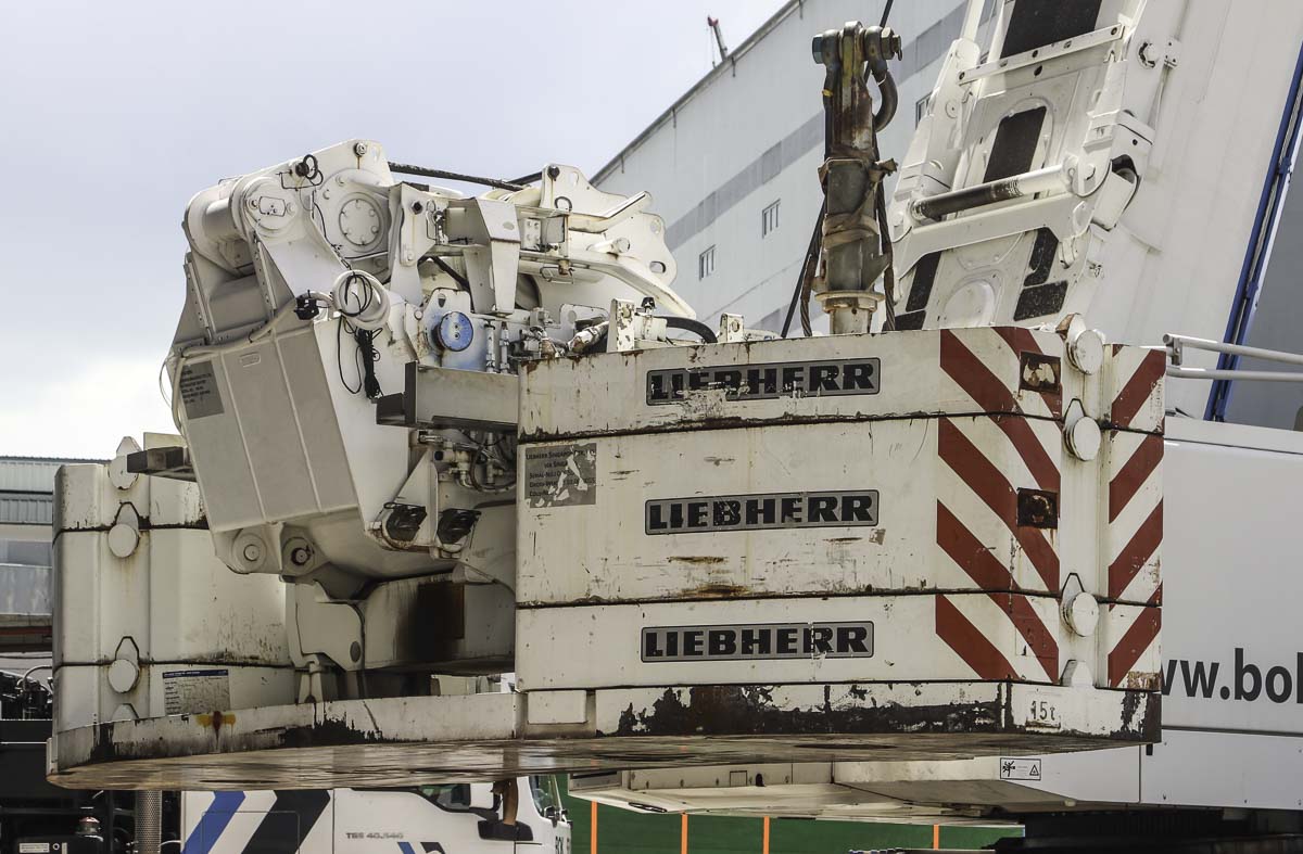 Am Oberwagen sind hier 60 Tonnen Ballast montiert, der gesammte Ballast wiegt 140 Tonnen. Der Drehkreis des Ballasts ist 5,7 Meter.