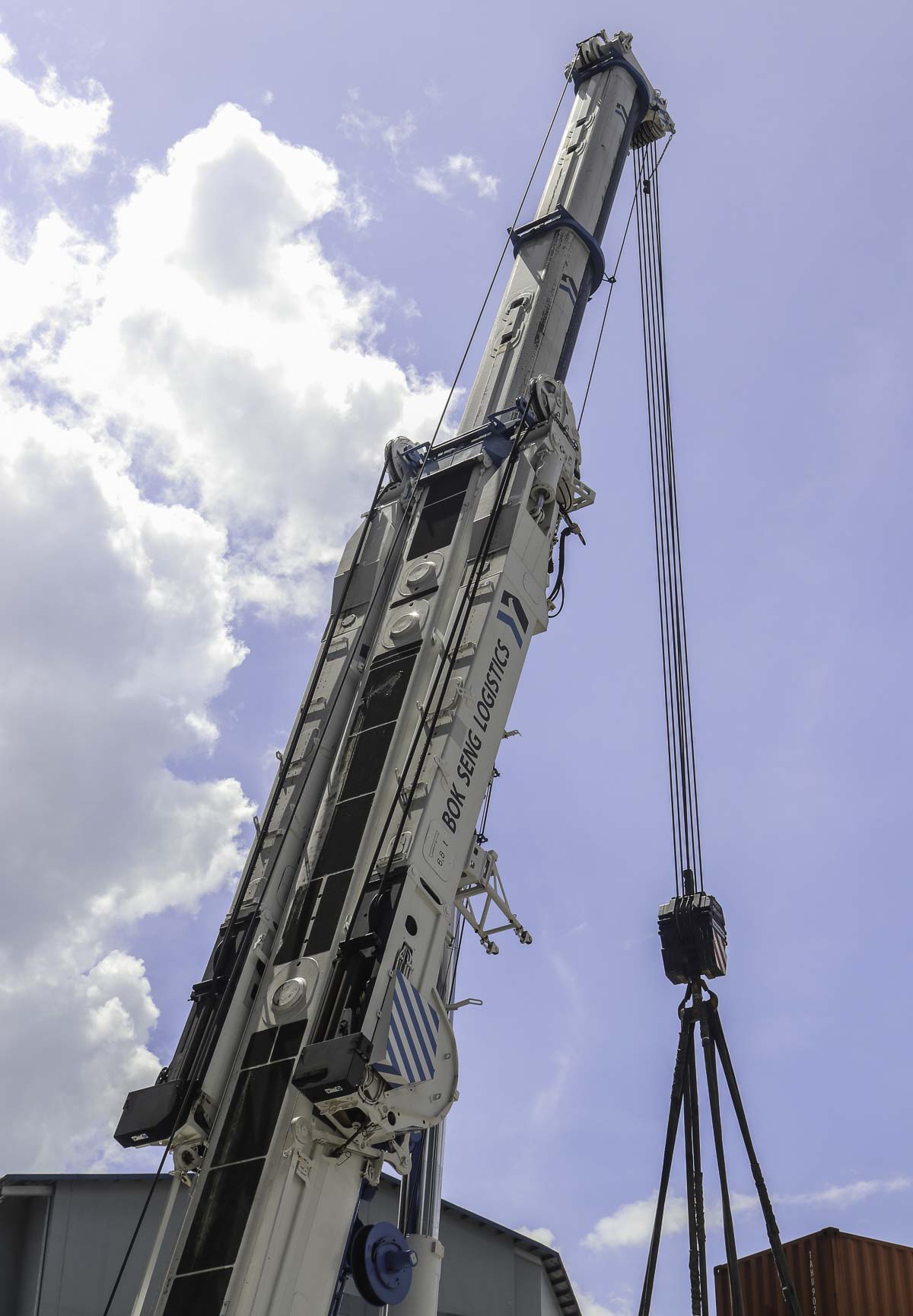 Der Kran hat einen sechs-teiligen Hauptausleger mit einer Mindestlänge von 14,9 Metern und fahrt bis maximal 70 Metern aus. Hier ist der Hauptausleger auf eine Länge von 25 Metern ausgefahren. Optional kann der Hauptausleger mit einer YSL-Abspannung ausgeführt werden.