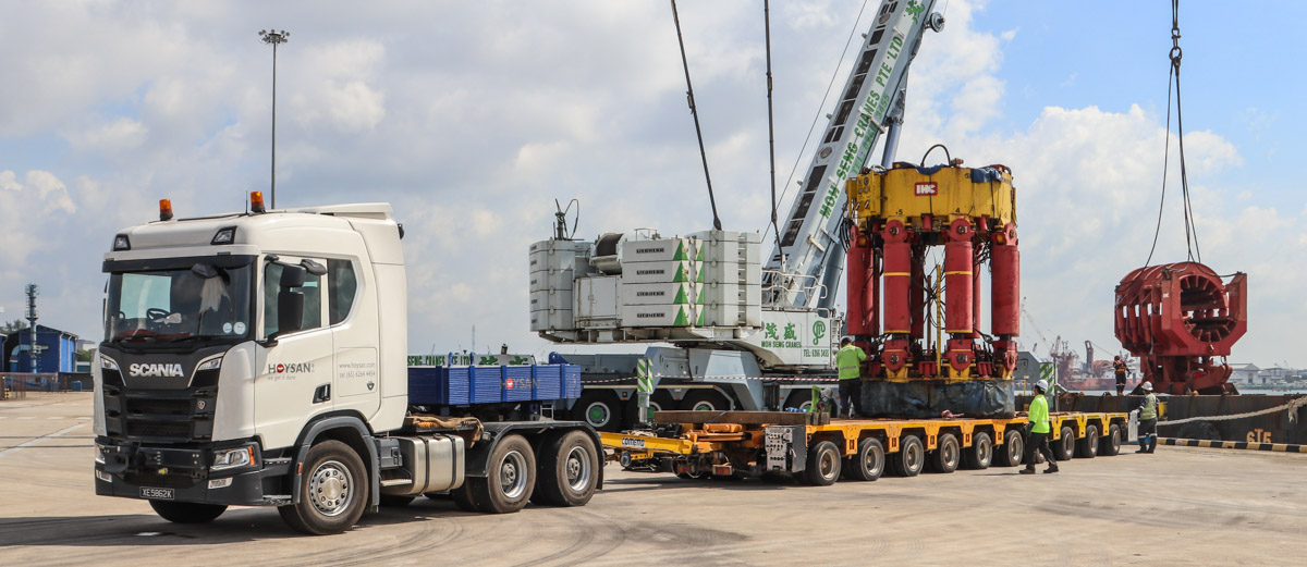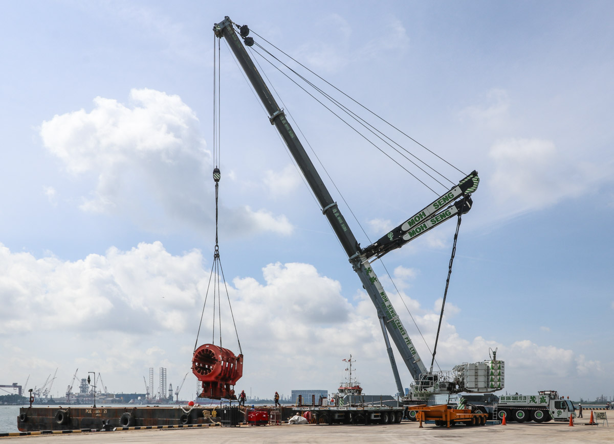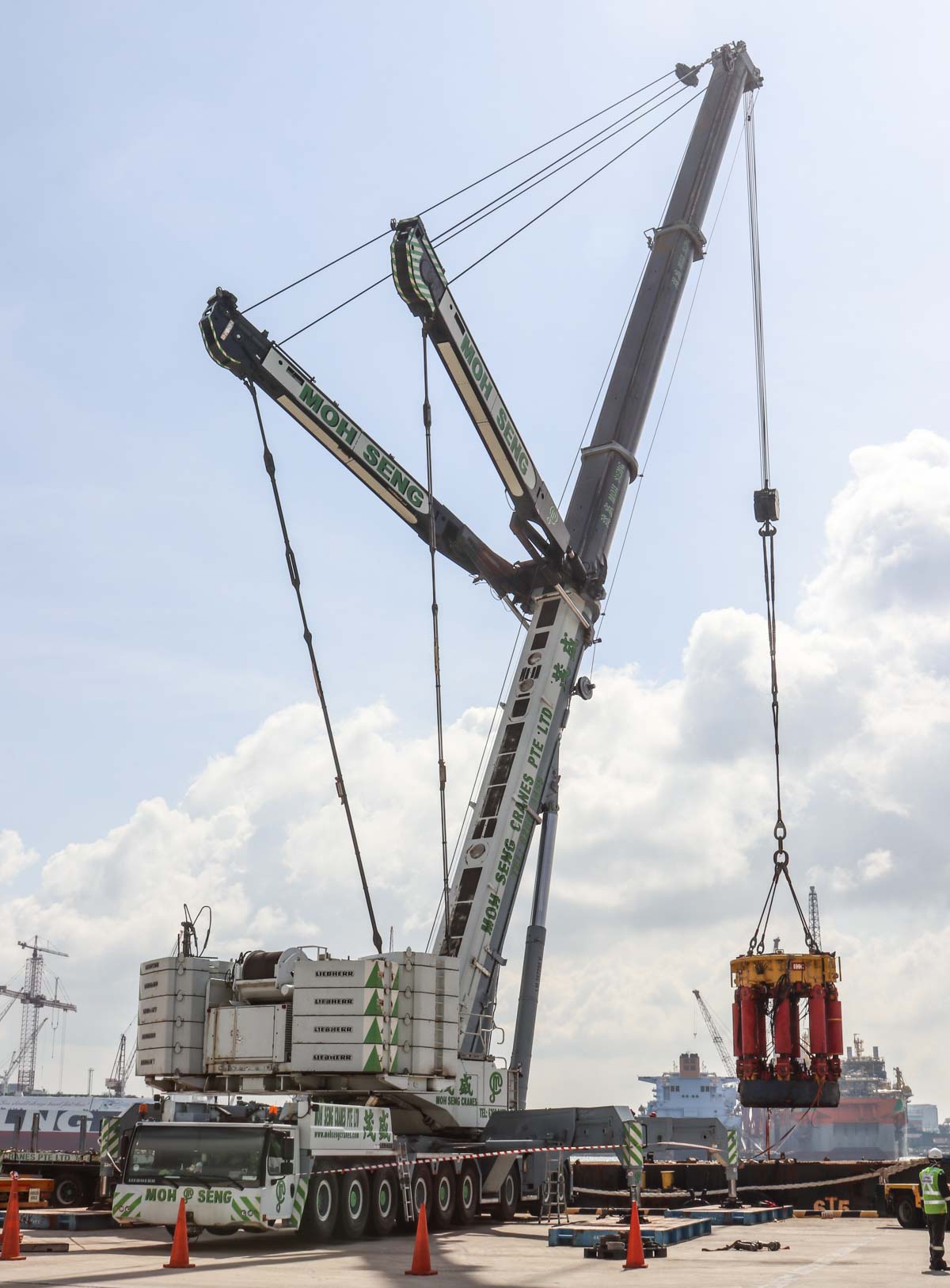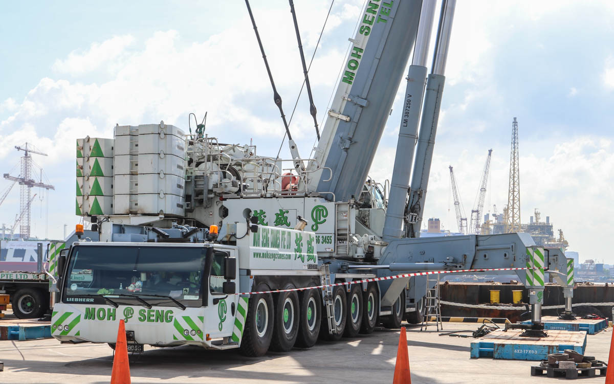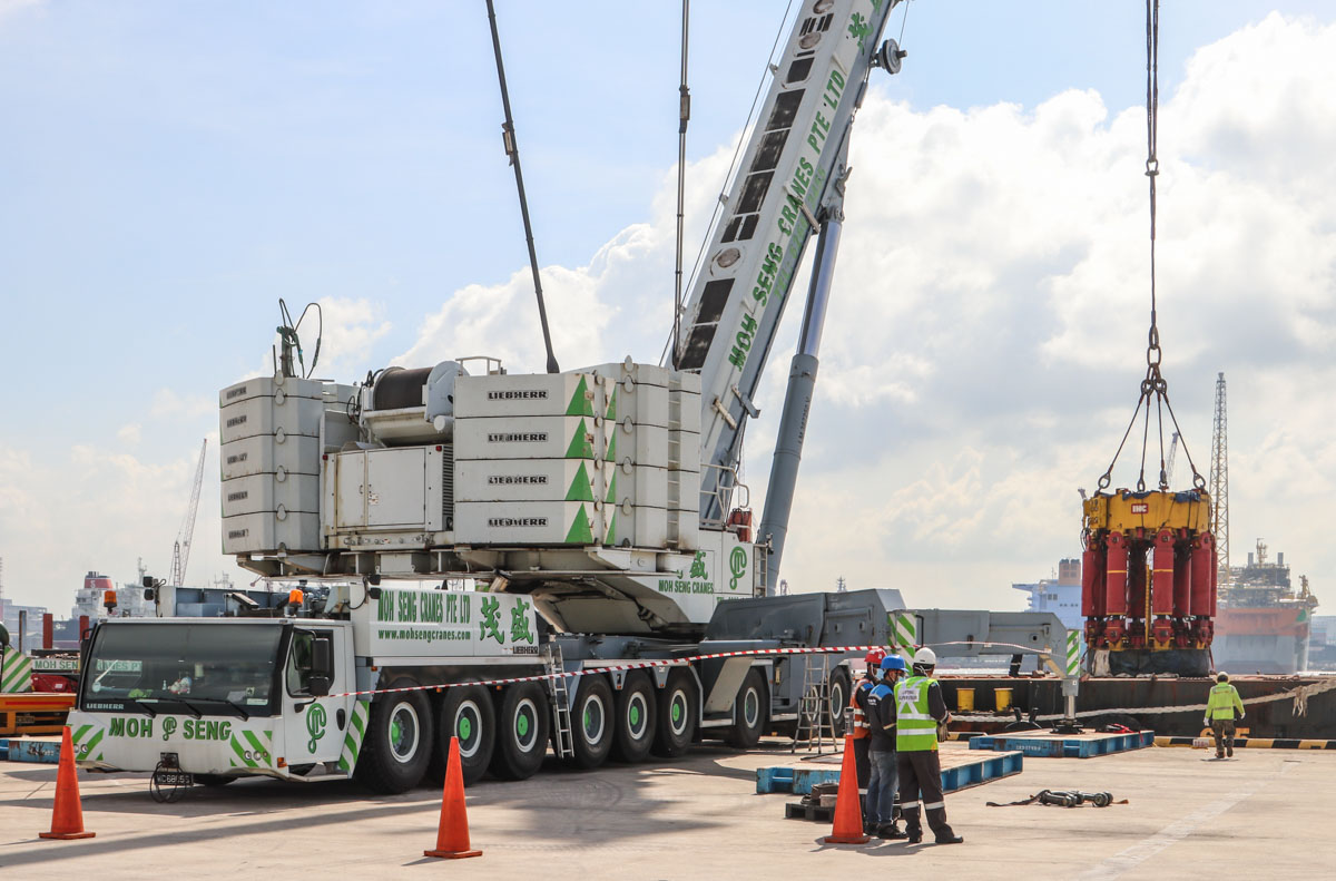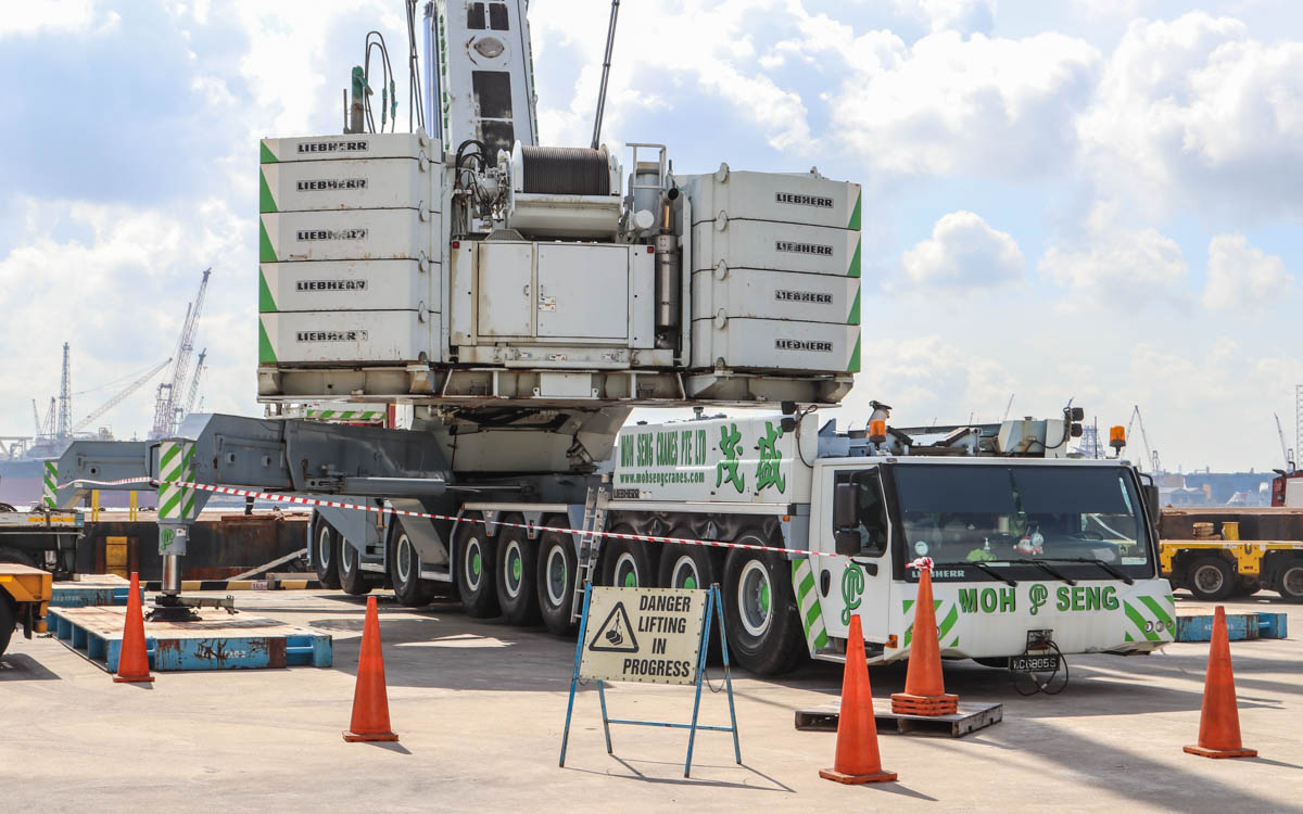 Hier wurde der eindrucksvolle Liebherr LTM 1750-9.1 von Moh Seng aus Singapur (SG) im Auftrag von Bok Seng eingesetzt, um zwei schwere Komponenten von einem Ponton zu heben und auf Transportkombinationen zu verladen.