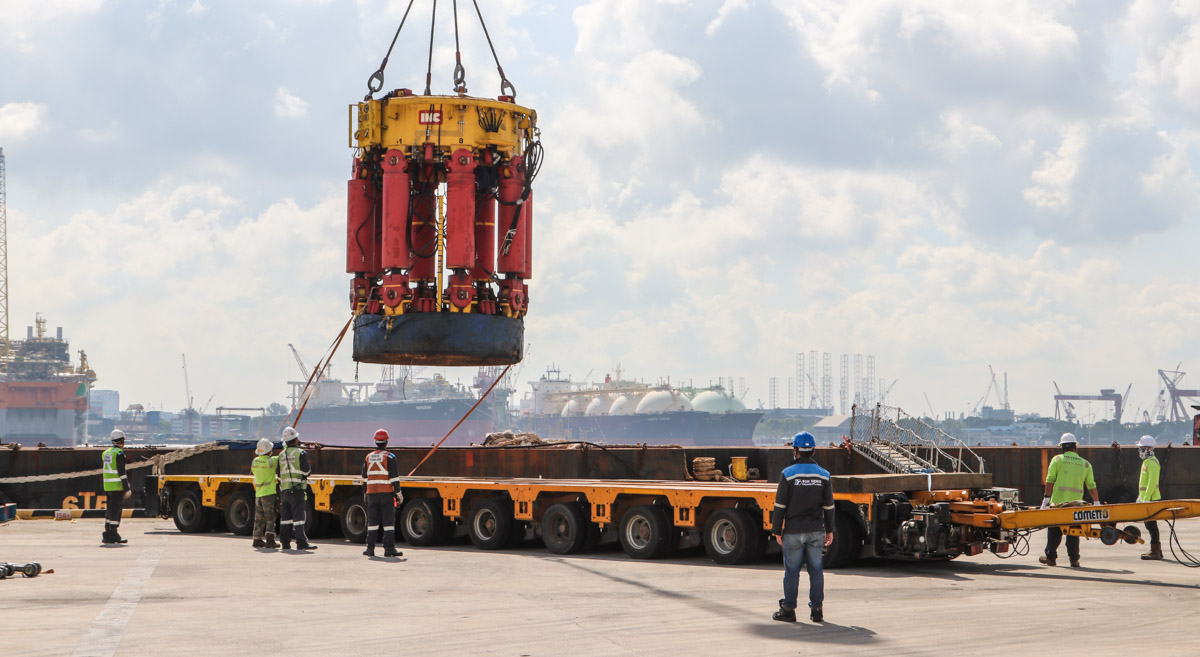 Die Last, ein Bauteil, das beim Offshore-Rammen eingesetzt wird, soll auf einen bereitstehenden 10-achsigen Cometto-Plattformtrailer verladen werden.
