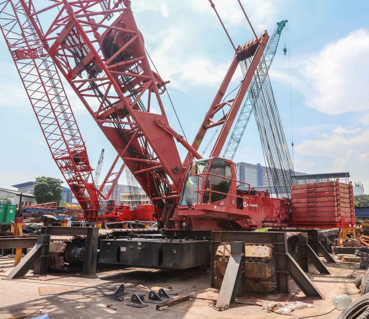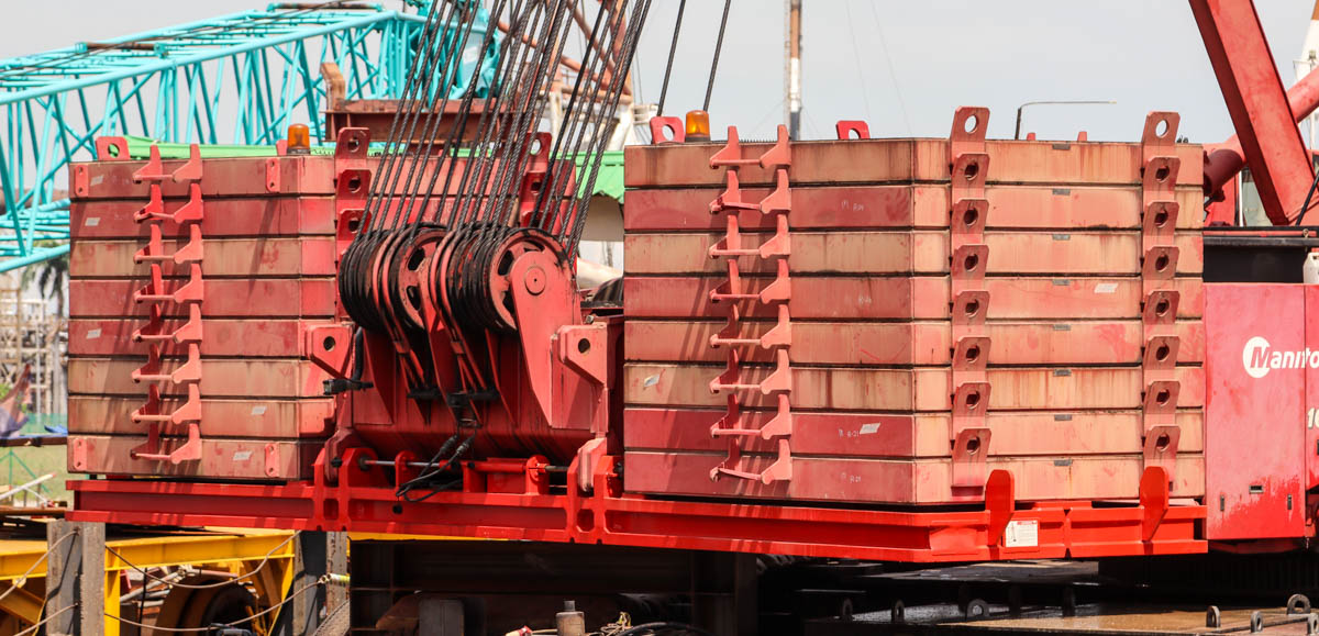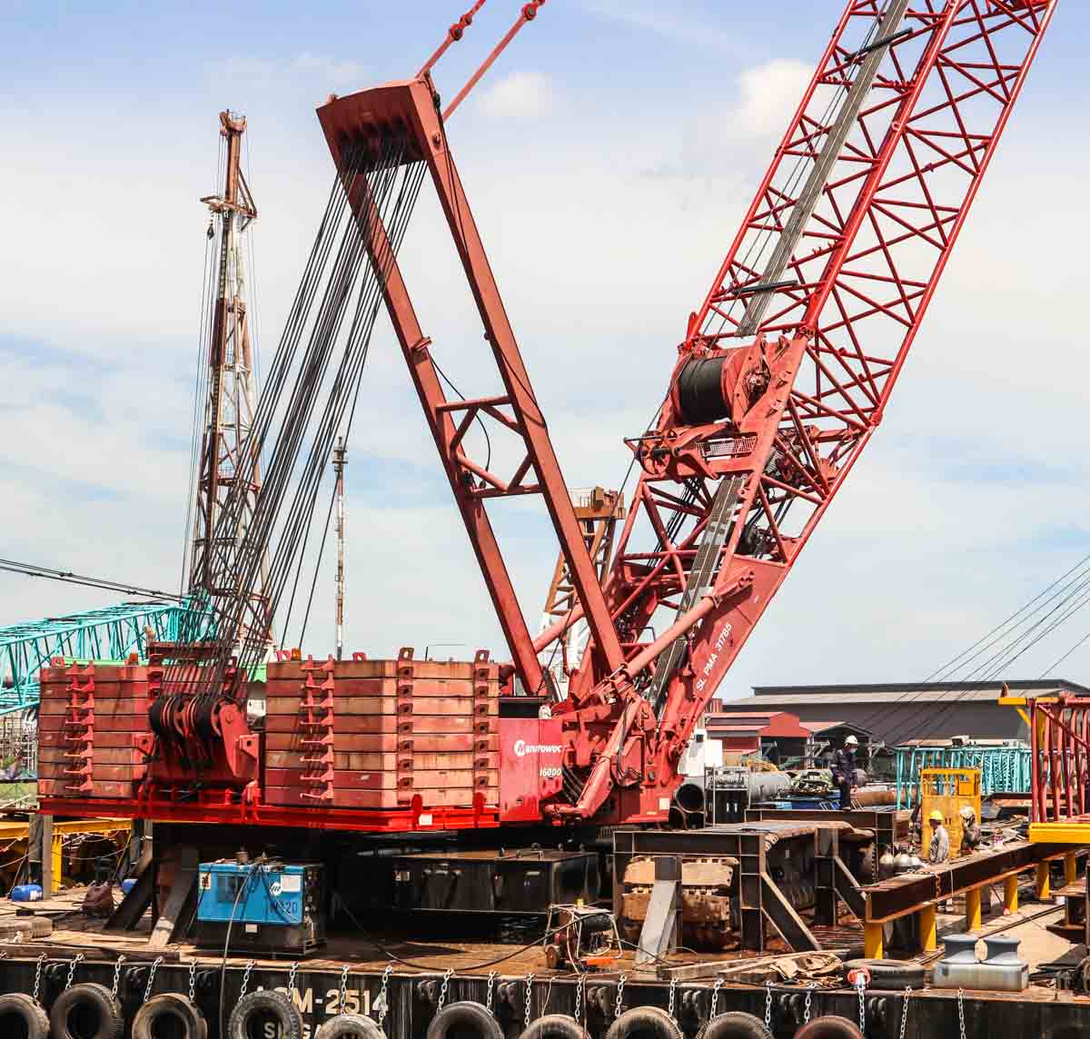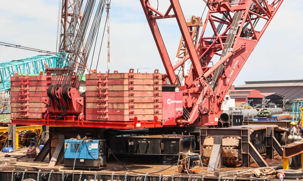 Im Jahr 2021 nahm Antara Koh aus Singapur (SG) direkt zwei dieser interessanten Manitowoc 16000 Raupenkrane in Betrieb. Beide Krane kamen gebraucht aus Malaysien und stammen aus dem Baujahr 2007. Jeder Kran wurde auf einem Ponton aufgebaut und für ein großes Projekt vor der afrikanischen Küste vorbereitet.