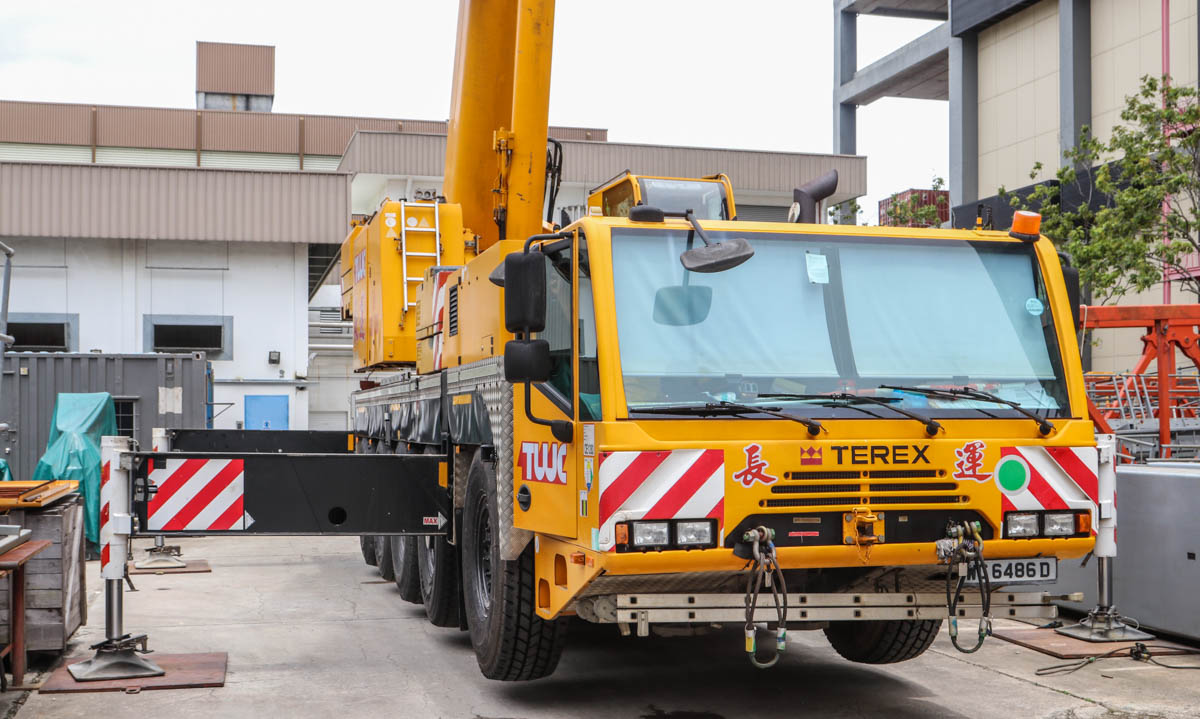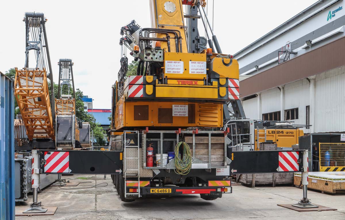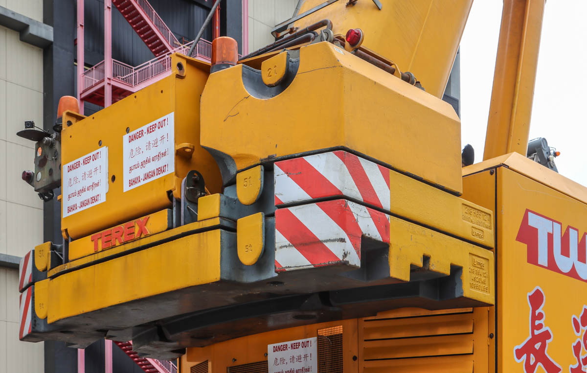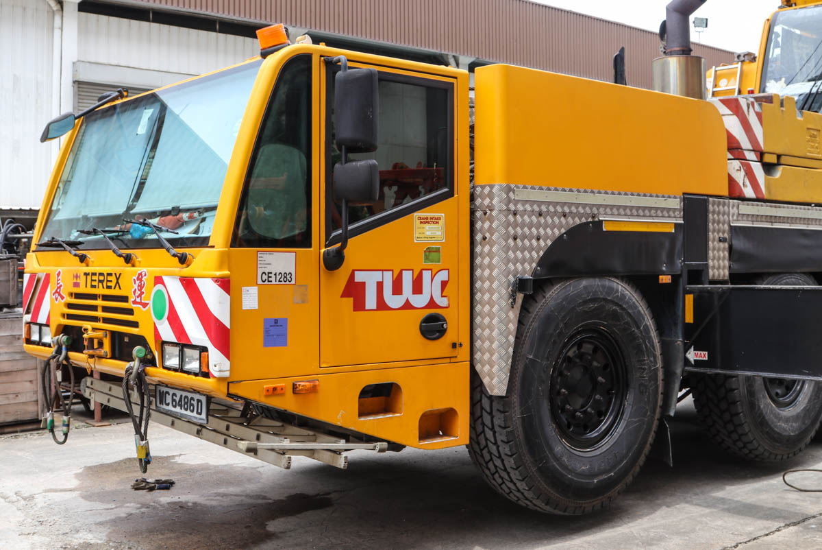 Dieser beeindruckende Terex AC 100 von Tiong Woon aus Singapur (SG) wurde auf einem Lagerplatz für neue Baumaschinen für leichte Arbeiten eingesetzt. Es handelt sich um einen 100-Tonnen-Teleskopkran, der auf einem fünfachsigen Unterwagen montiert ist.