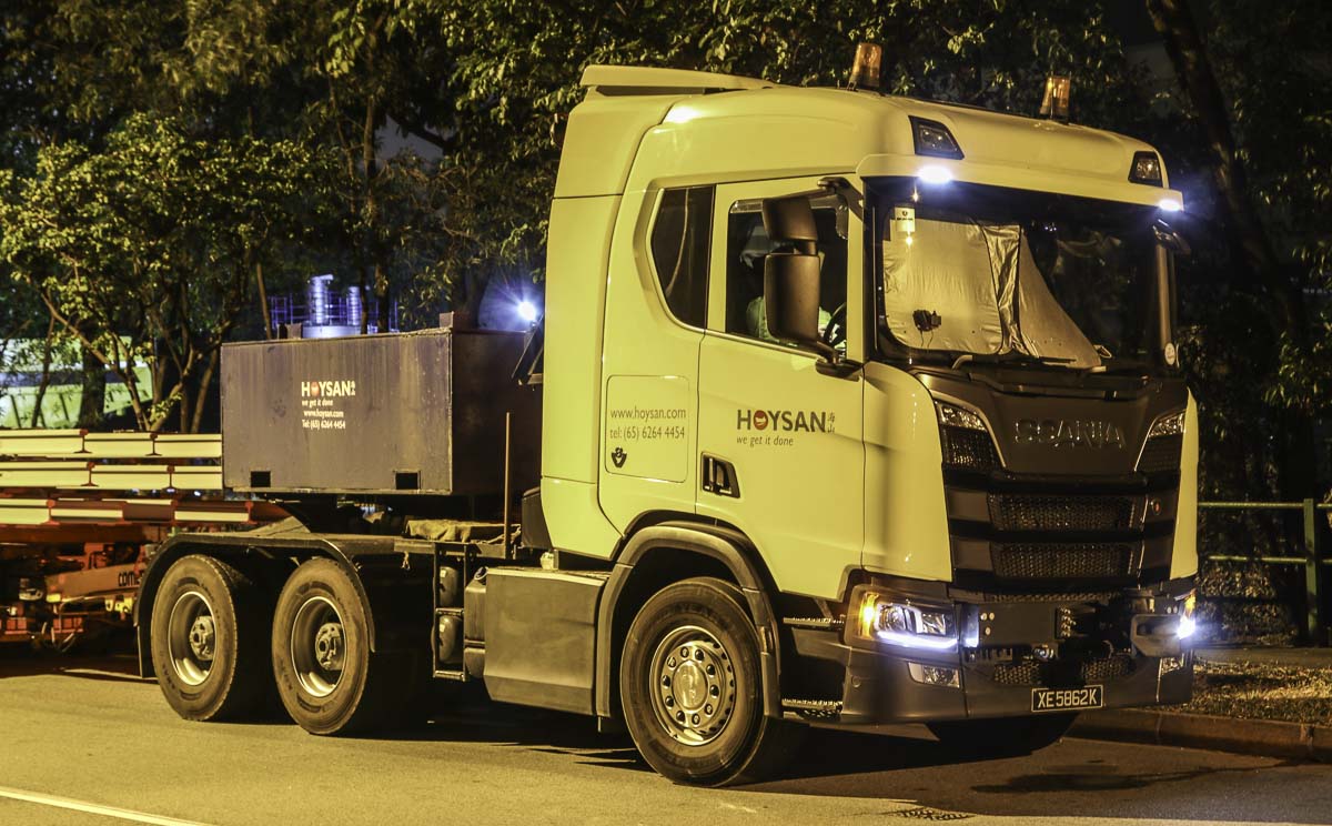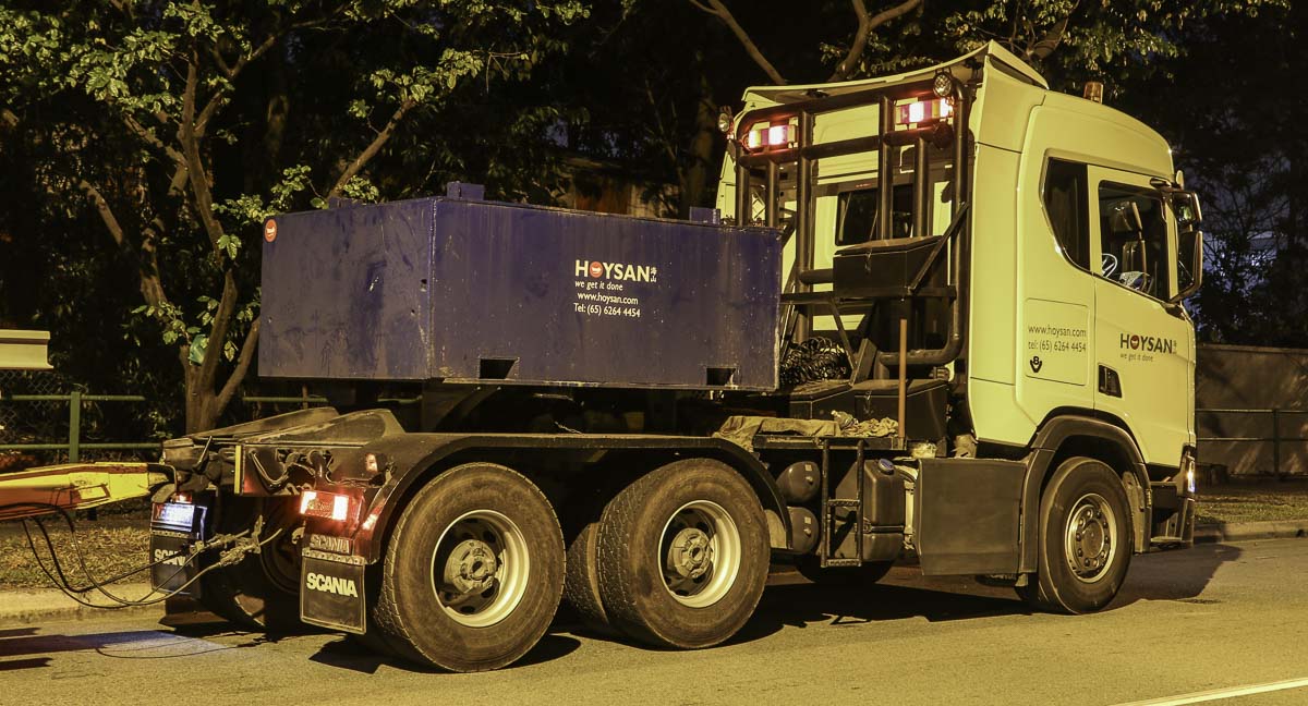 In 2020 hat Hoysan aus Singapur (SG) diesen schönen Scania R 730 im Betrieb genommen. Es handelt sich um eine 3-Achs-Sattelzugmaschine mit einem 6x4-Antrieb und wird grundsätzlich für Schwertransporteinsätze eingesetzt. Hier stand die Sattelzugmaschine während eines Wochenendes entlang der Straße geparkt.