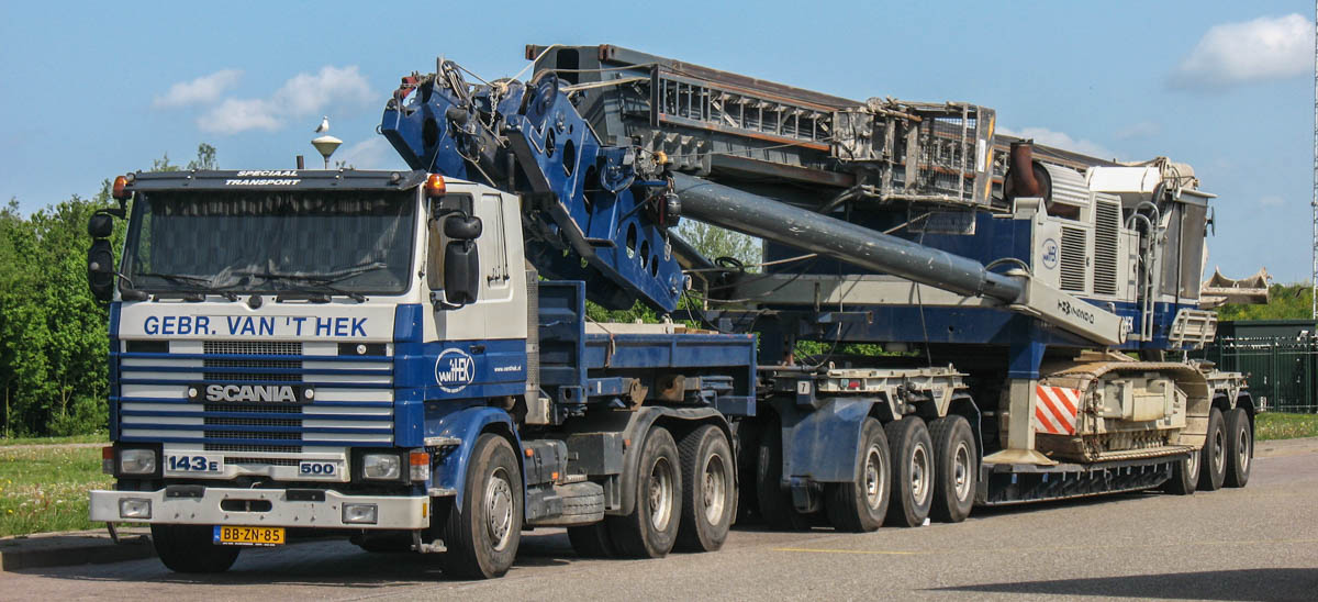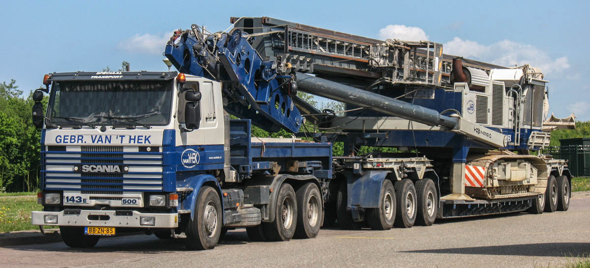 Van 't Hek aus Z.O. Beemster (NL) verfügte über diese beeindruckende und sehr attraktive Scania 143 E 500, die primär mit Ballastpritsche zum Ziehen eines 6-achsigen Anhängers eingesetzt wurde. Die gesamte Kombination wurde von B.Q. de Ruyter aus Amsterdam (NL) übernommen.