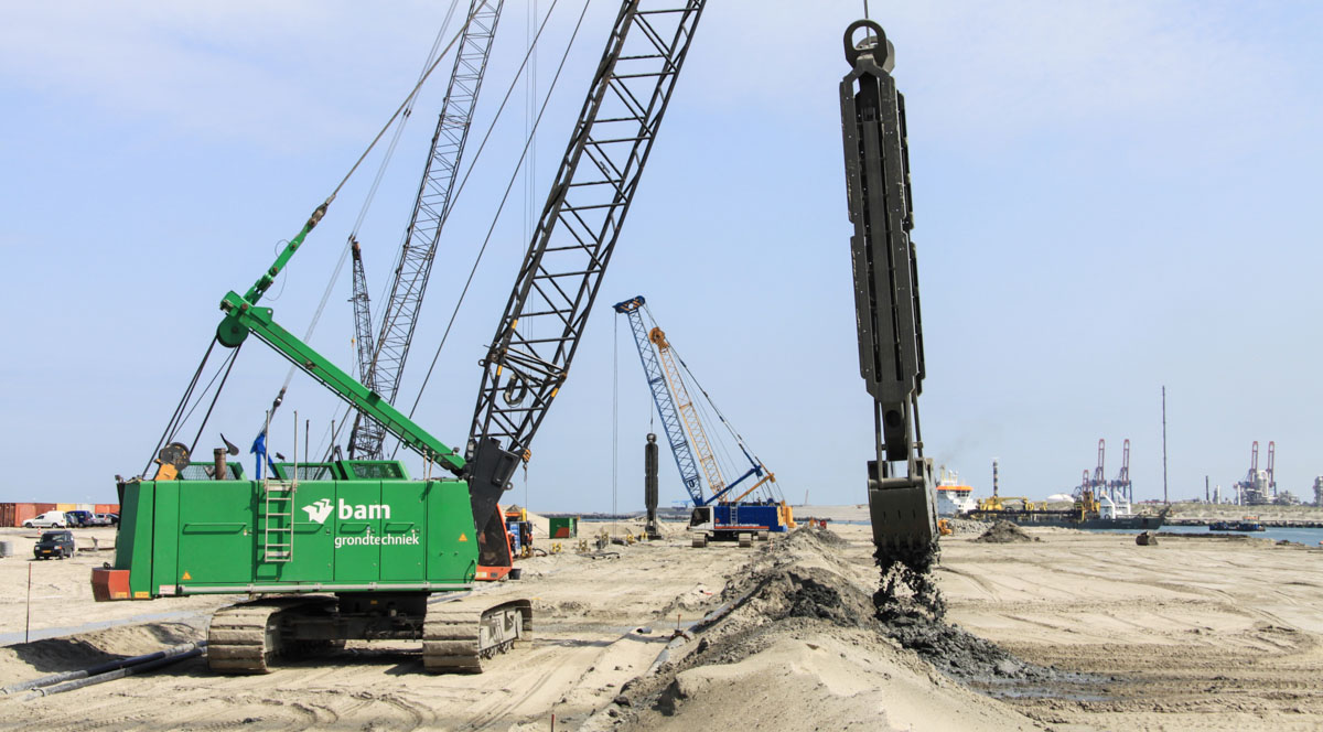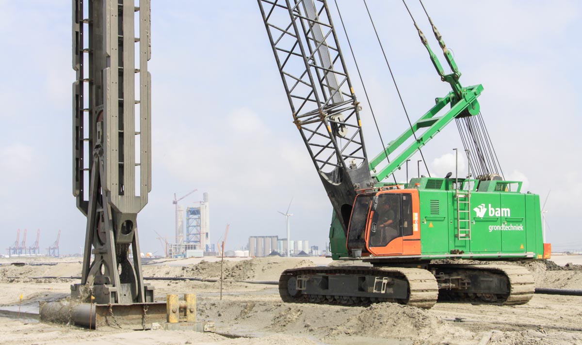 Der Liebherr HS 875 HD Seilbagger von BAM Grondtechniek auf einem Einsatz mit Schlitzwandgreifer auf der zweite Maasvlakte (NL).
