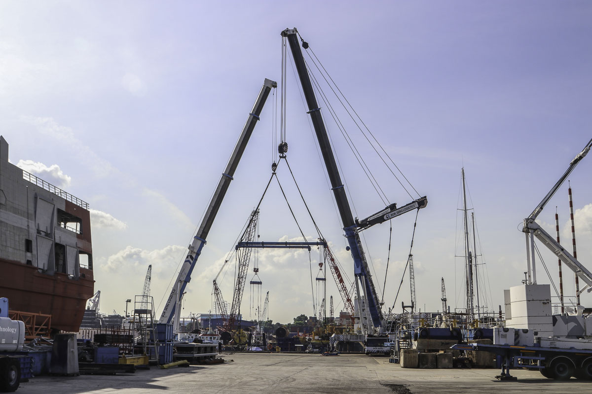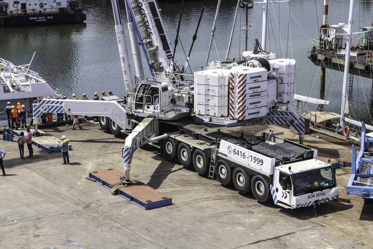 The largest crane used for this operation is the impressive Liebherr LTM 1750-9.1, the largest telescopic crane in the fleet of Bok Seng.