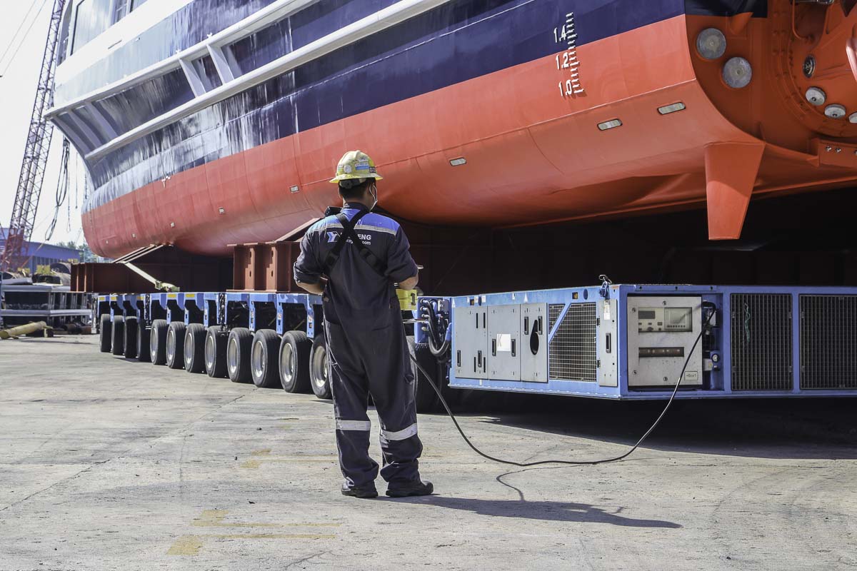 With great precision, the ferry is driven from the fabrication hall to the two cranes.