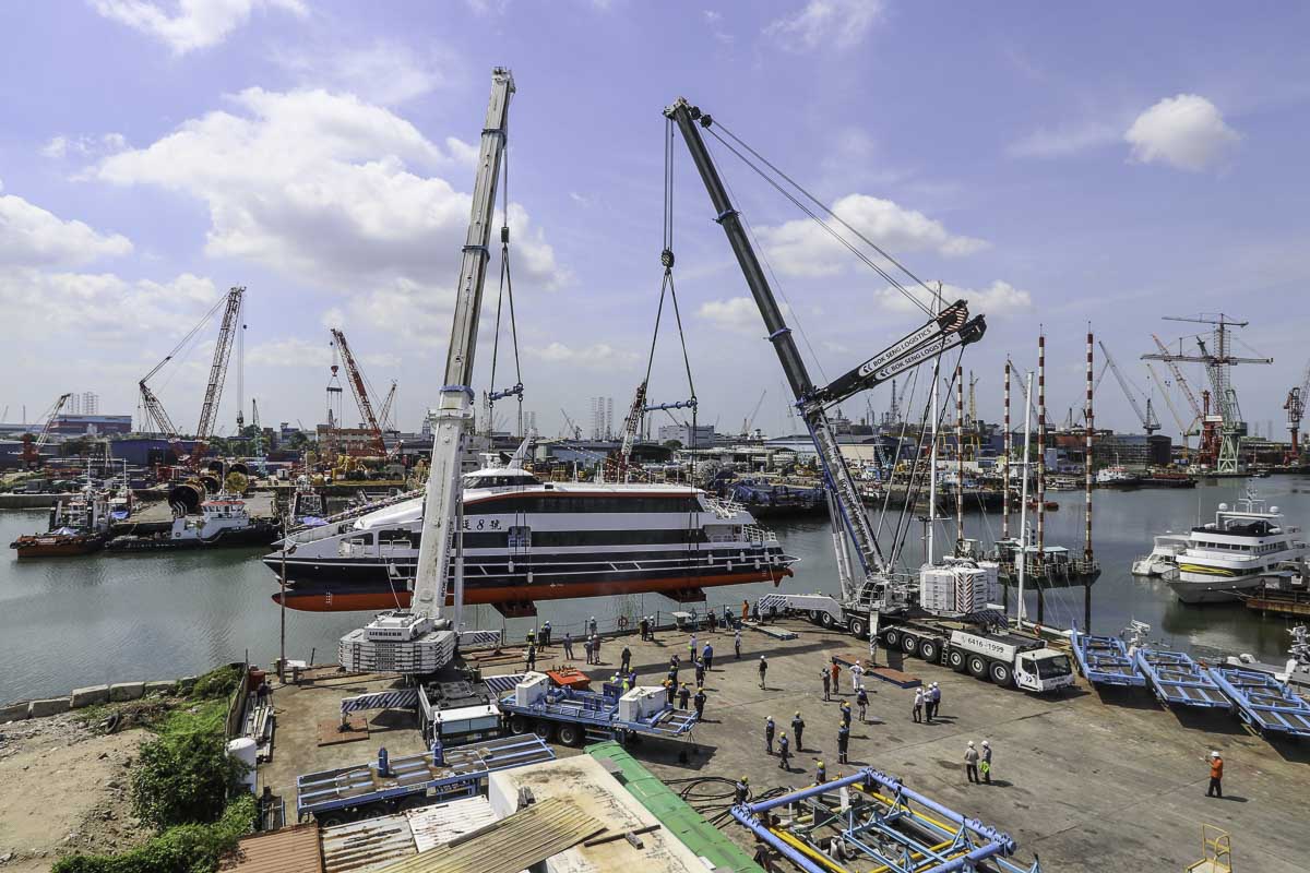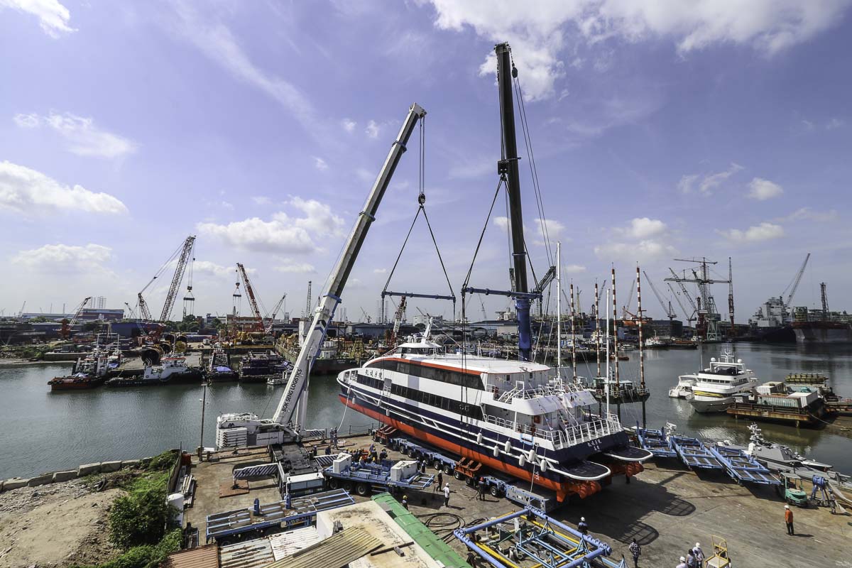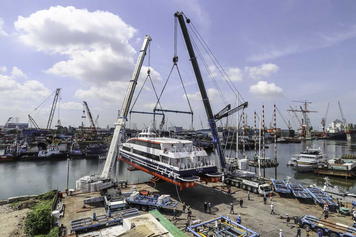 This is the ferry that has to be lifted into the water. It was built at a shipyard belonging to the Bok Seng Group.