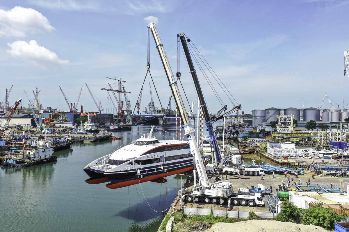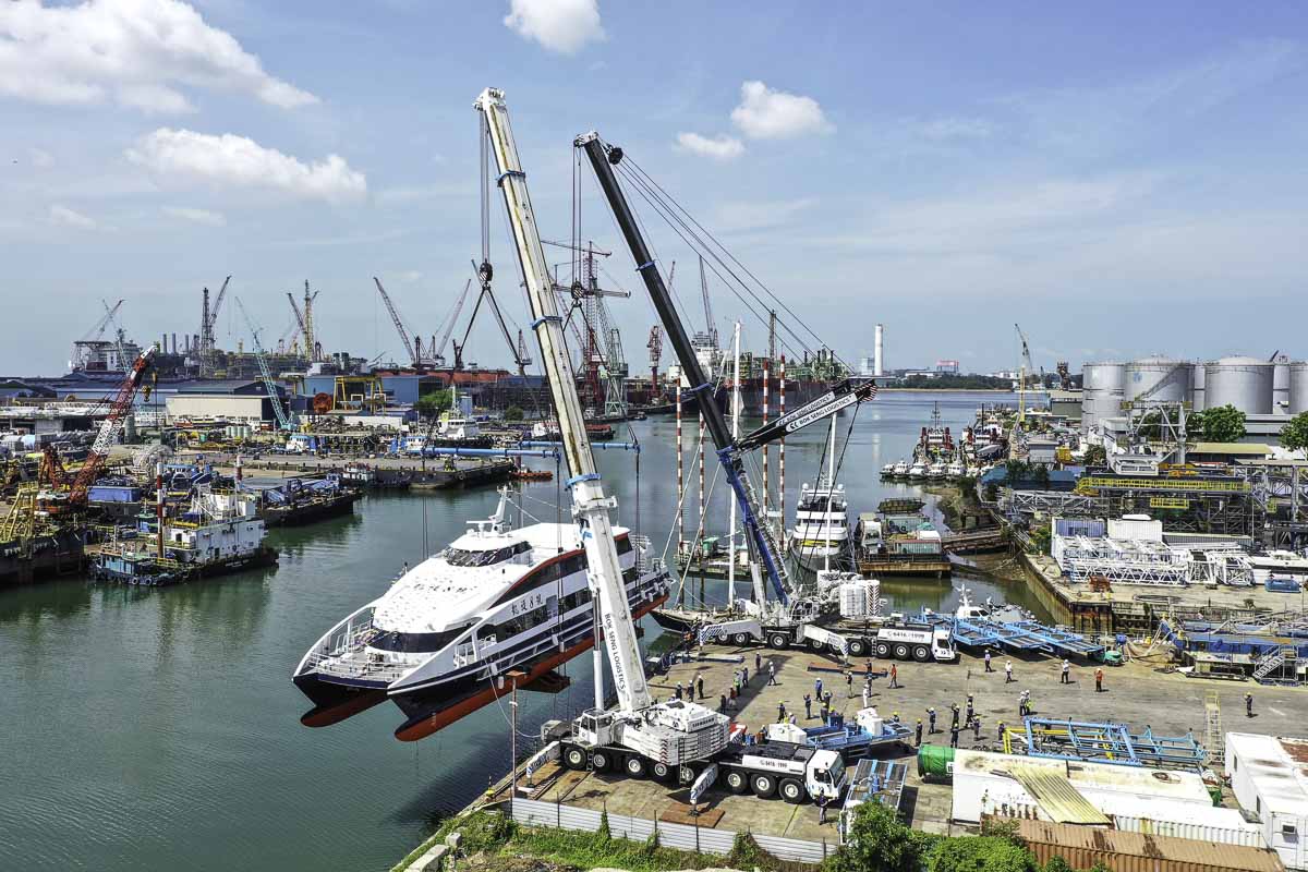 Two large mobile cranes from Bok Seng of Singapore (SG) are standing ready on a sunny Saturday morning to lift a heavy ferry into the water.