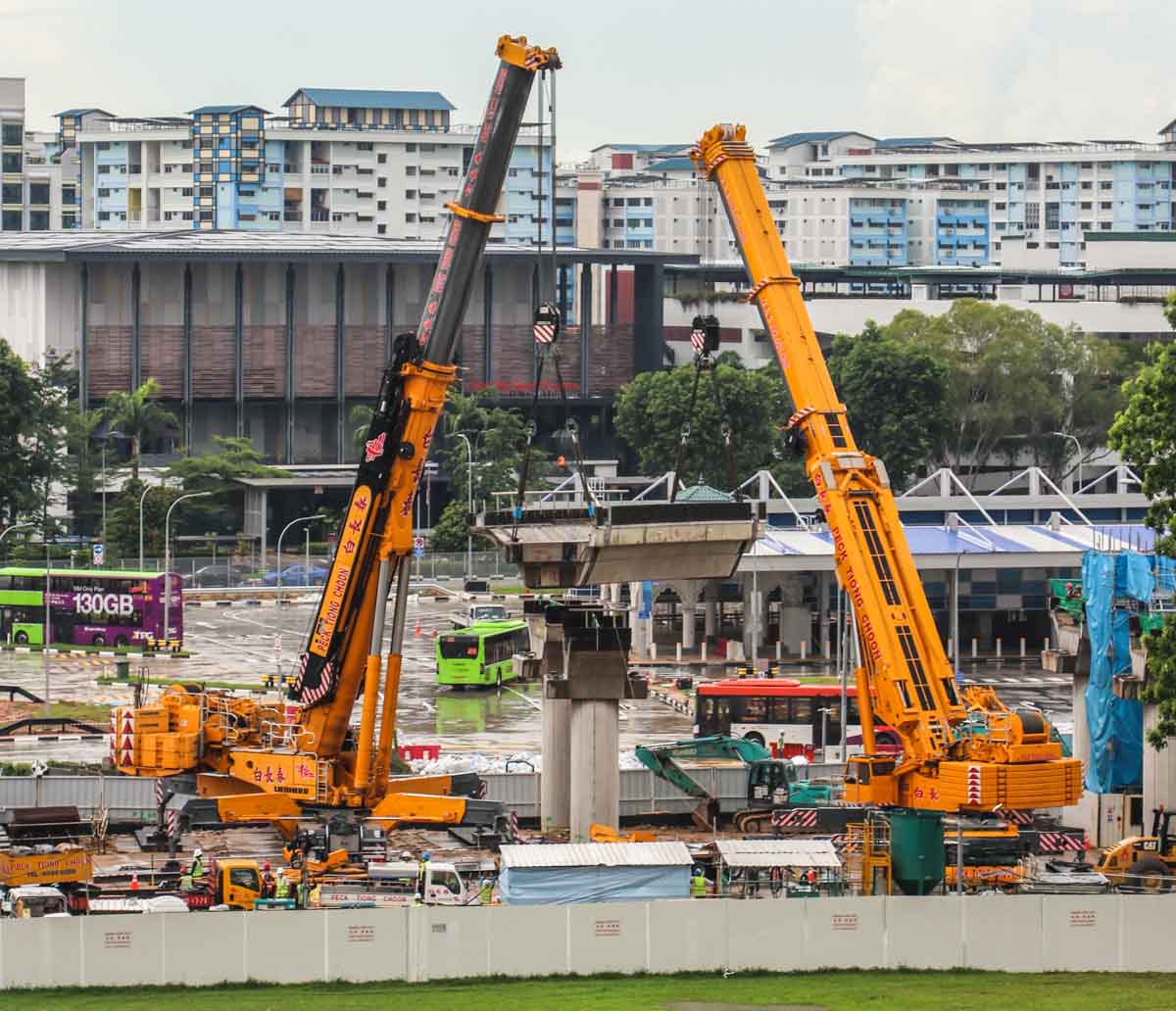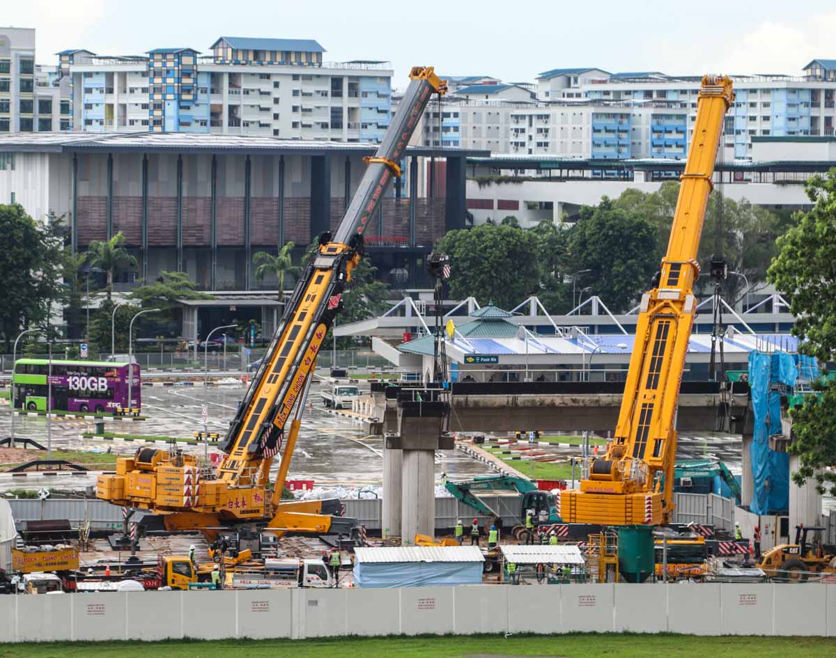 Two large mobile cranes from Peck Tiong Choon from Singapore (SG) are being prepared on a construction site there for heavy lifting operations.