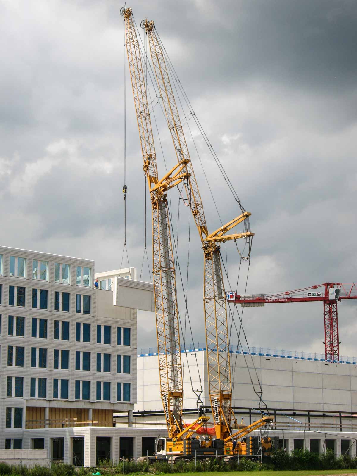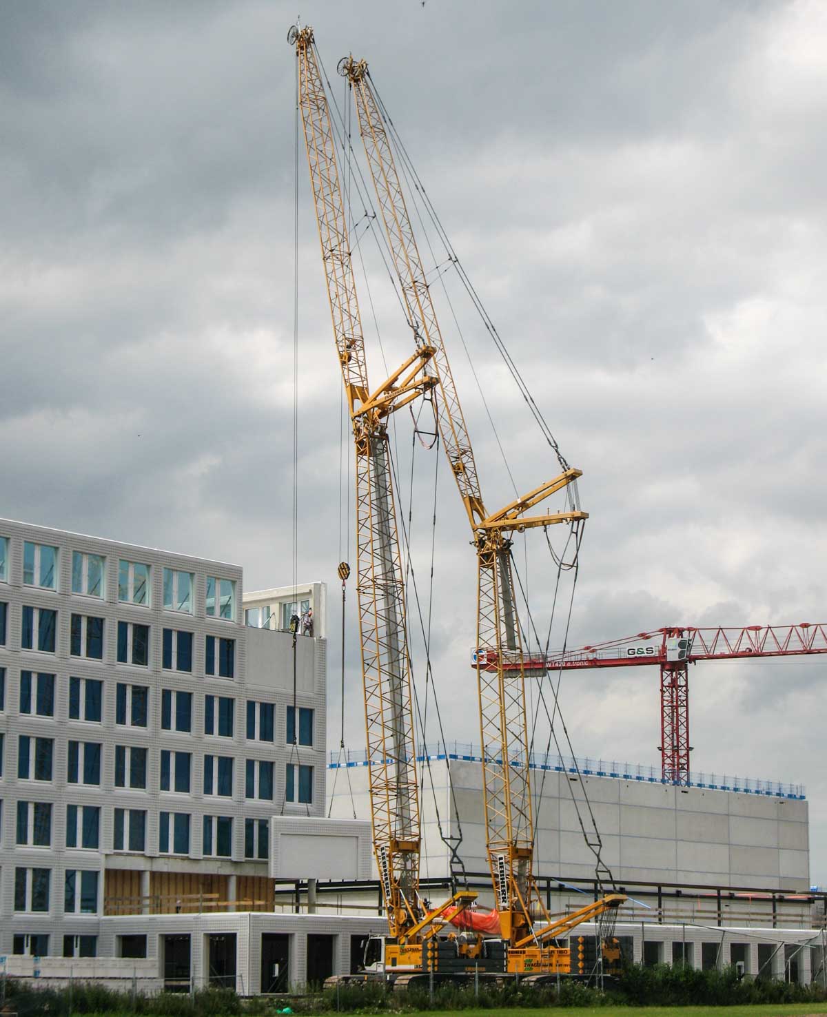 The Liebherr LR 1130 (left) was configured with a 32-metre main boom and a 28.7-metre luffing jib. The Liebherr LR 1160 (right) was equipped with a 25.7-metre main boom and a 34.4-metre luffing jib.
