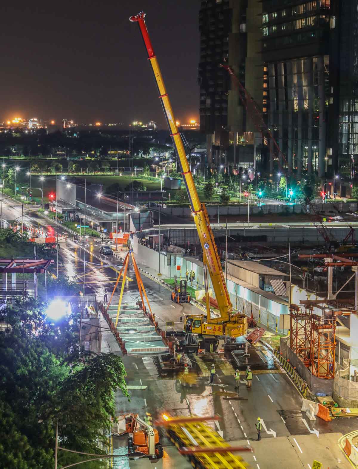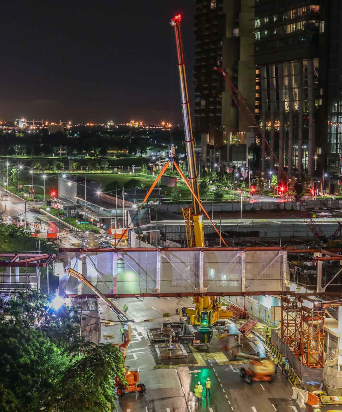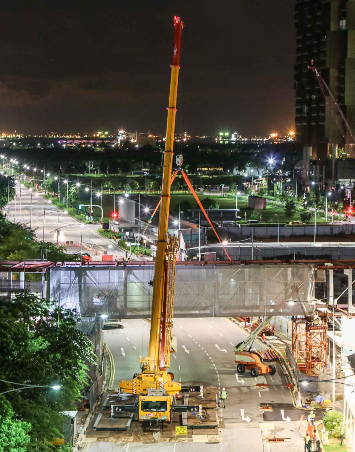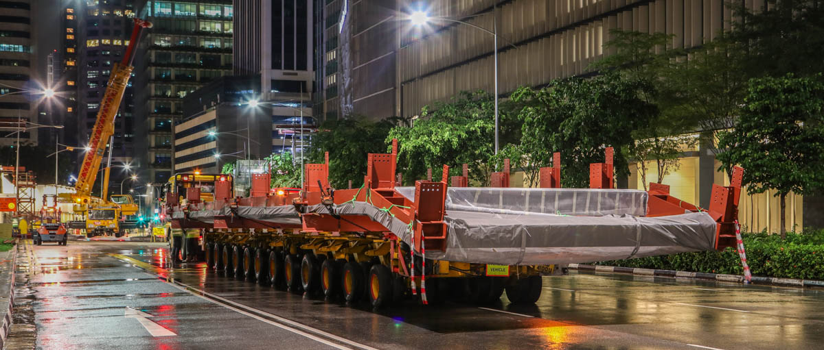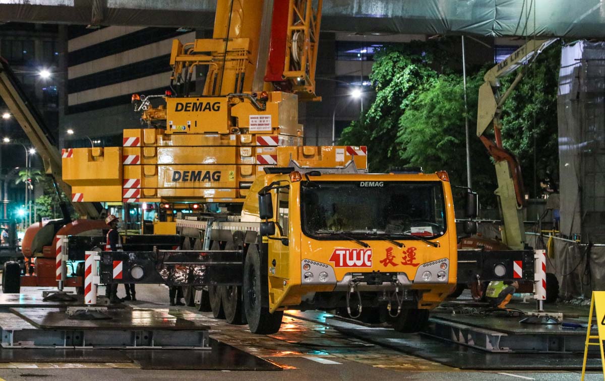 For the installation of two large steel trusses over a wide road in the centre of Singapore (SG), Tiong Woon deployed a new Demag AC 160-5. It is approximately 02:00 hours, the load has arrived and the crane is set up in the middle of the road. The lifting operation will begin shortly.