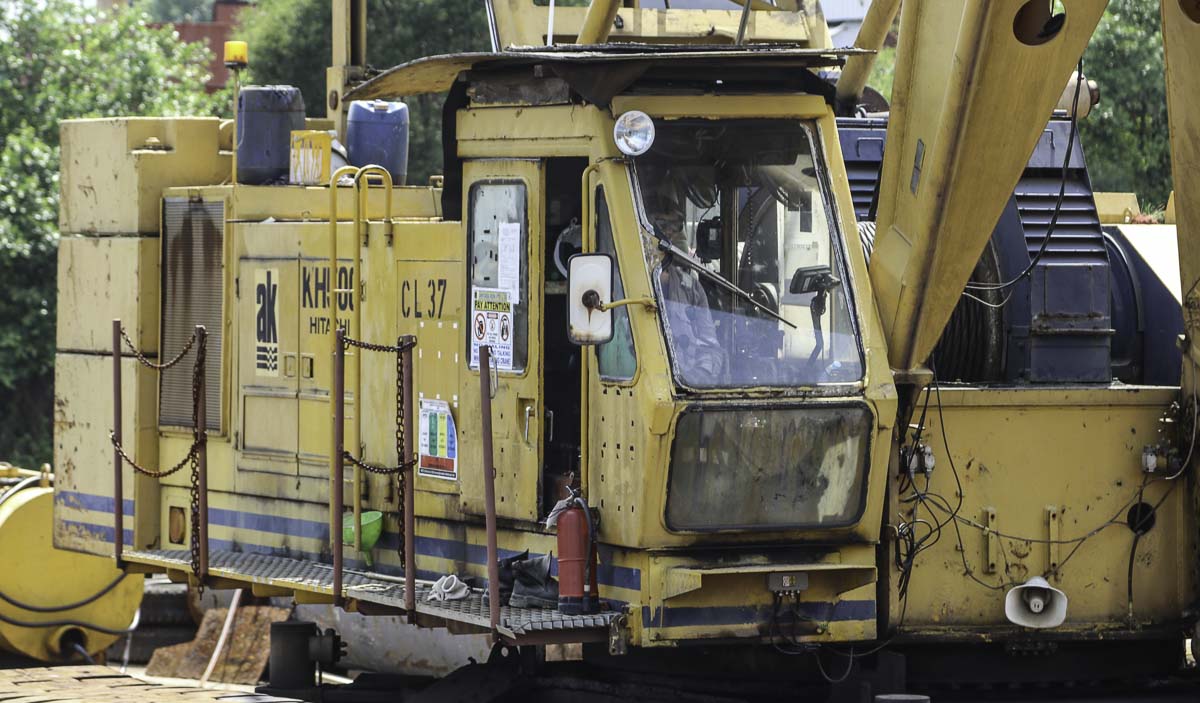 This fine Hitachi KH500-3 belongs to Antara Koh from Singapore (SG) and is deployed from a pontoon. It is a 100-ton crawler crane.