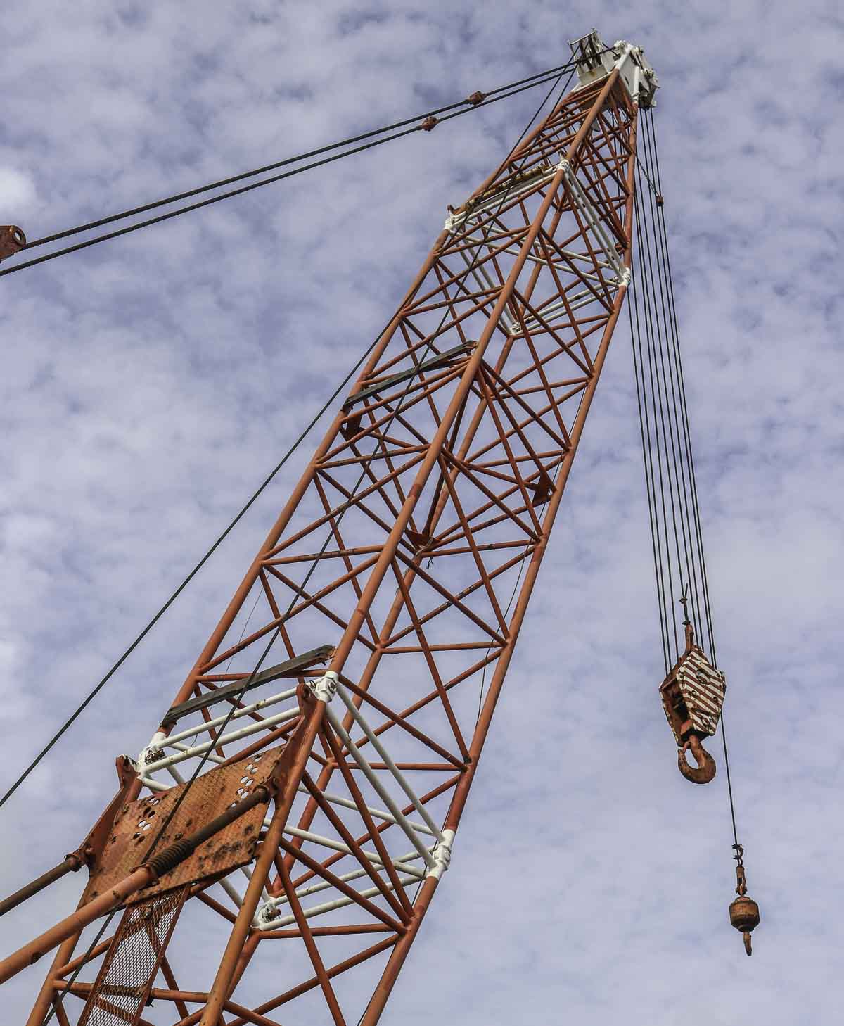 The main boom has a 13 meter base length and can be extended in steps of 3 meters to a maximum length of 52 meters. Here was the crane fitted with a 22 meter long main boom. In this configuration is the crane able to hoist maximum 30.2 tonnes at 5.1 meter radius of 4.7 tonnes to a 22 meter radius.