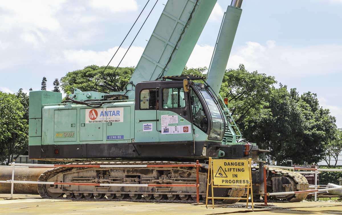 The crane was used as assist crane for a foundation rig. The maximum load of 90 tonnes is lifted at a three meter radius. When the boom is fully extended is the crane able to still hoist 26 tonnes on an eight meter radius.