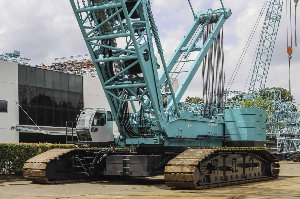 This sharp Kobelco SL6000 belongs to Sin Heng from Singapore (SG) and stood erected at their yard. Shortly before was this crane revised and repainted and looked like new again. It is a 550-tonne cralwer crane.