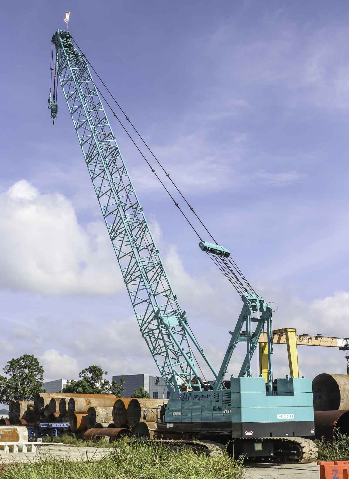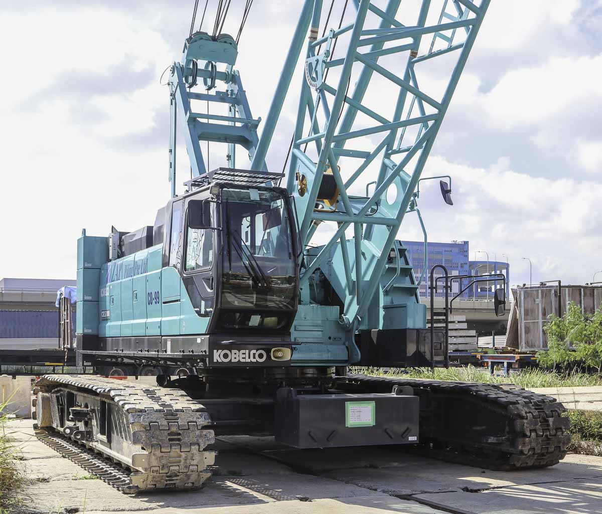 This beautiful Kobelco CKS800 belongs to ZAP Piling from Singapore (SG). The crawler crane is usually used as an auxiliary crane for foundation rigs. It is an 80-ton crawler crane built in 2021.