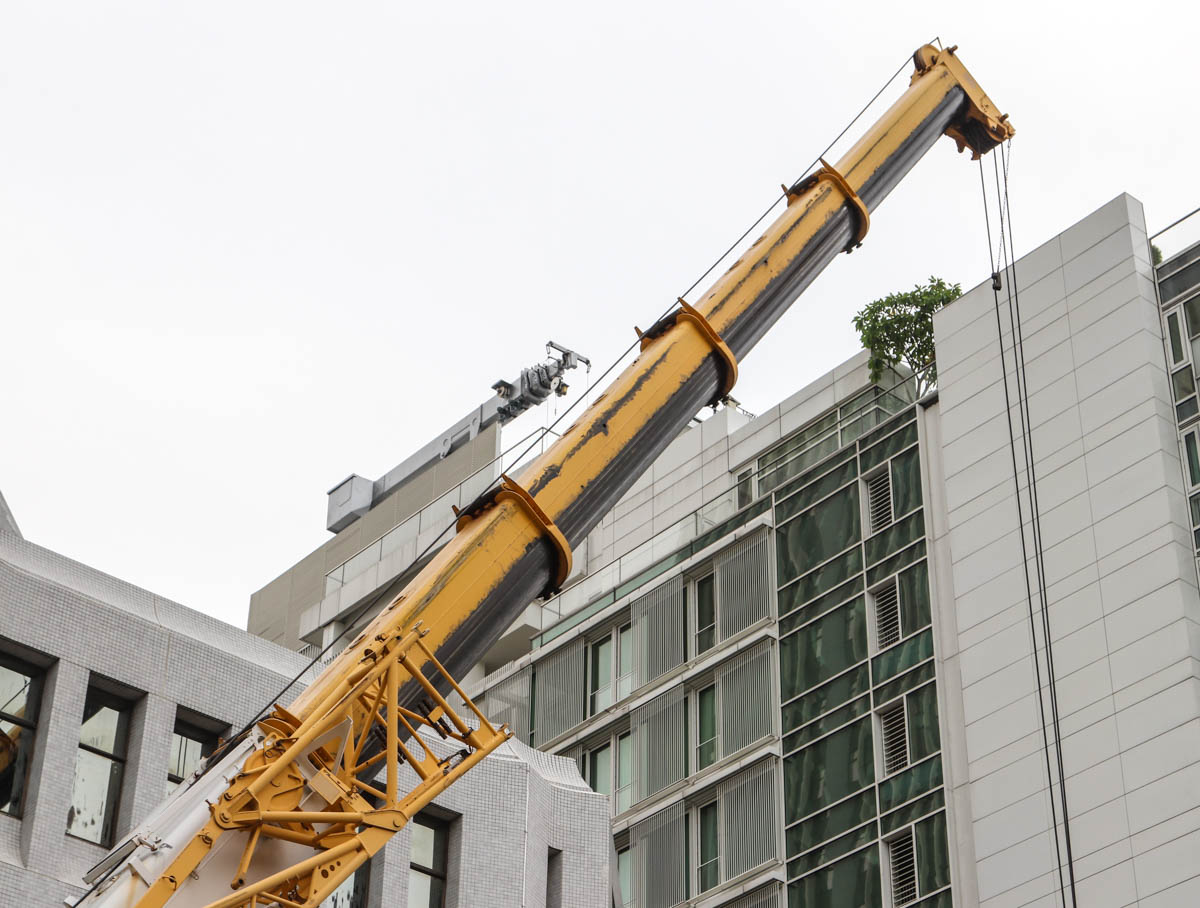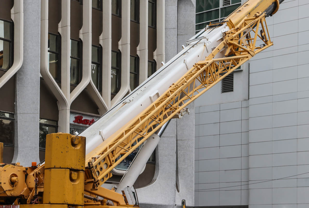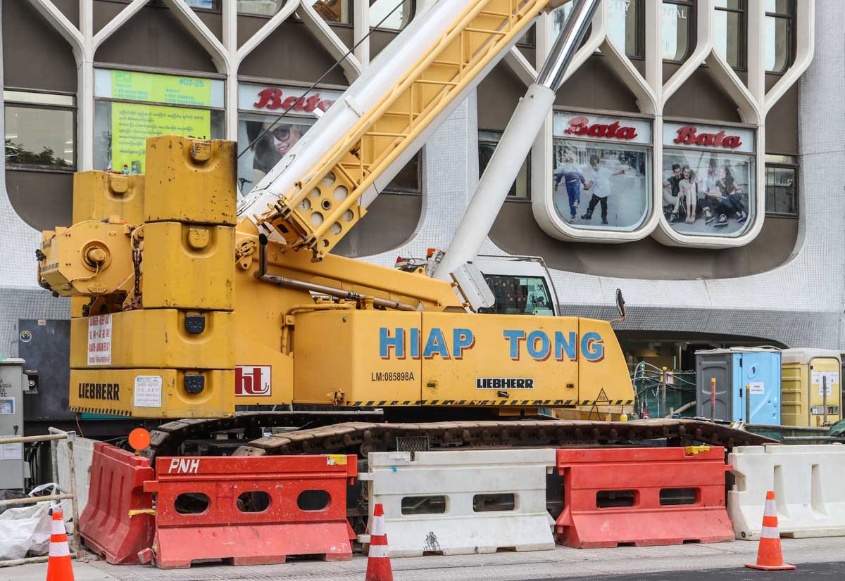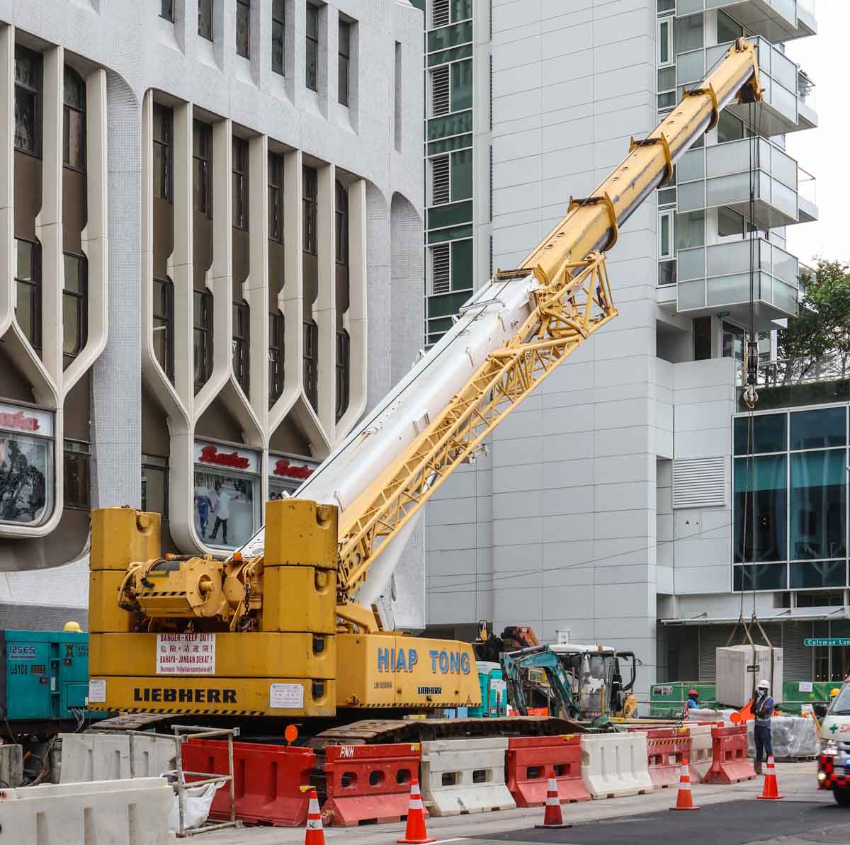This attractive Liebherr LTR 1100 of Hiap Tong from Singapore (SG) was deployed there in the city centre for lifting operations. It is a 100-tonne crawler crane with a telescopic boom.