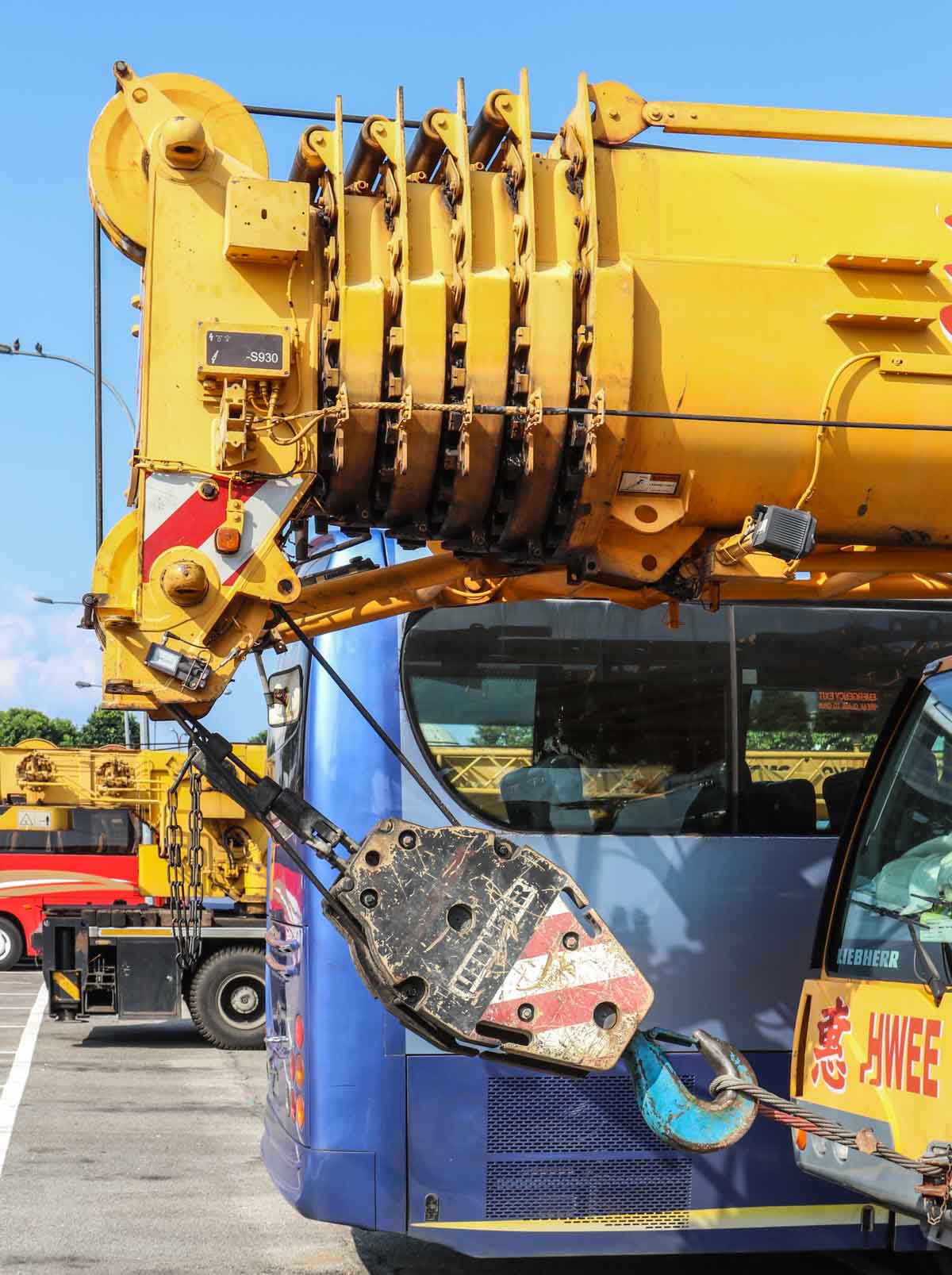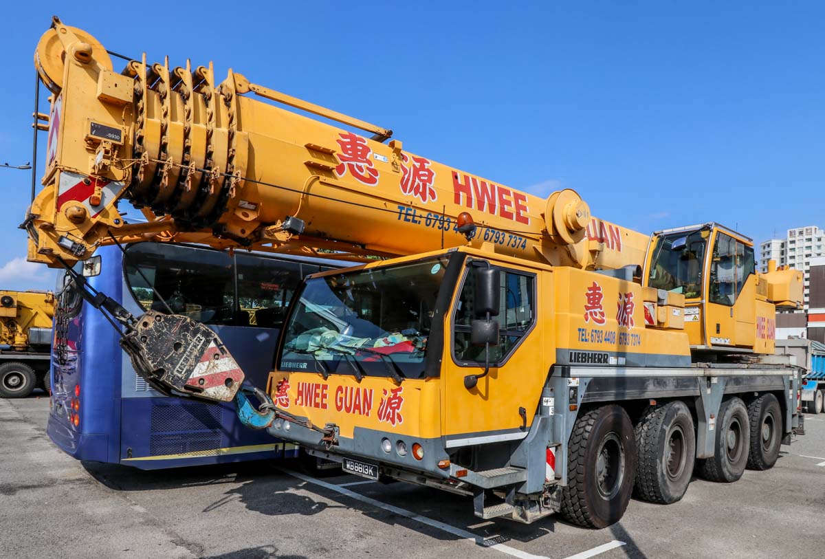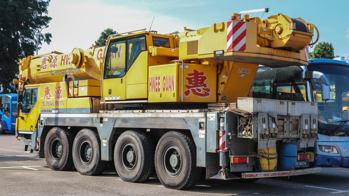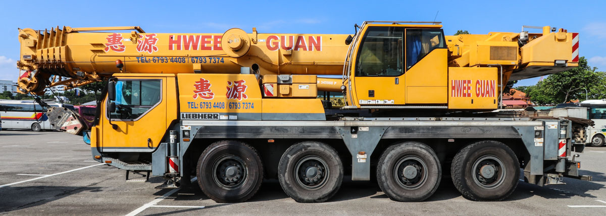 This Liebherr LTM 1070-4.2 from model year 2013 is operated by Hwee Guan from Singapore (SG). It is a 70-ton crane mounted on a 4-axle carrier.