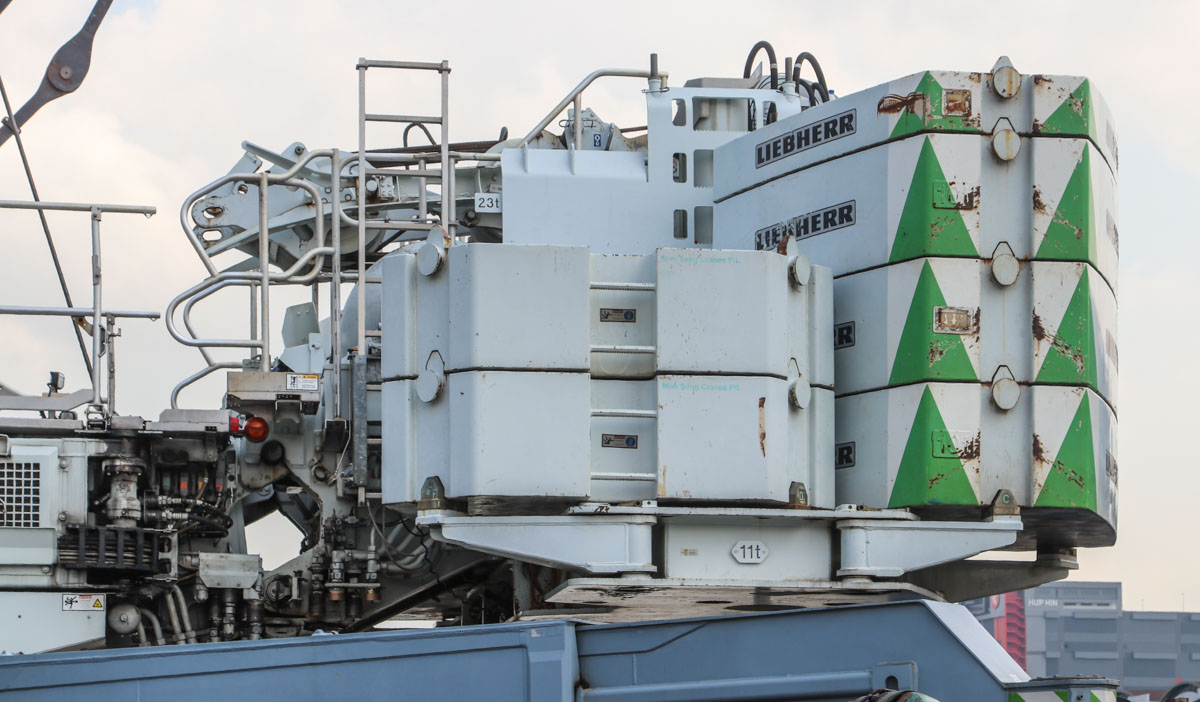Here, the crane was assembled with 144 tonnes of counterweight, giving a slewing radius of 8.33 metres in this configuration. The full counterweight of this crane is 204 tonnes.