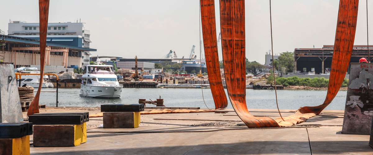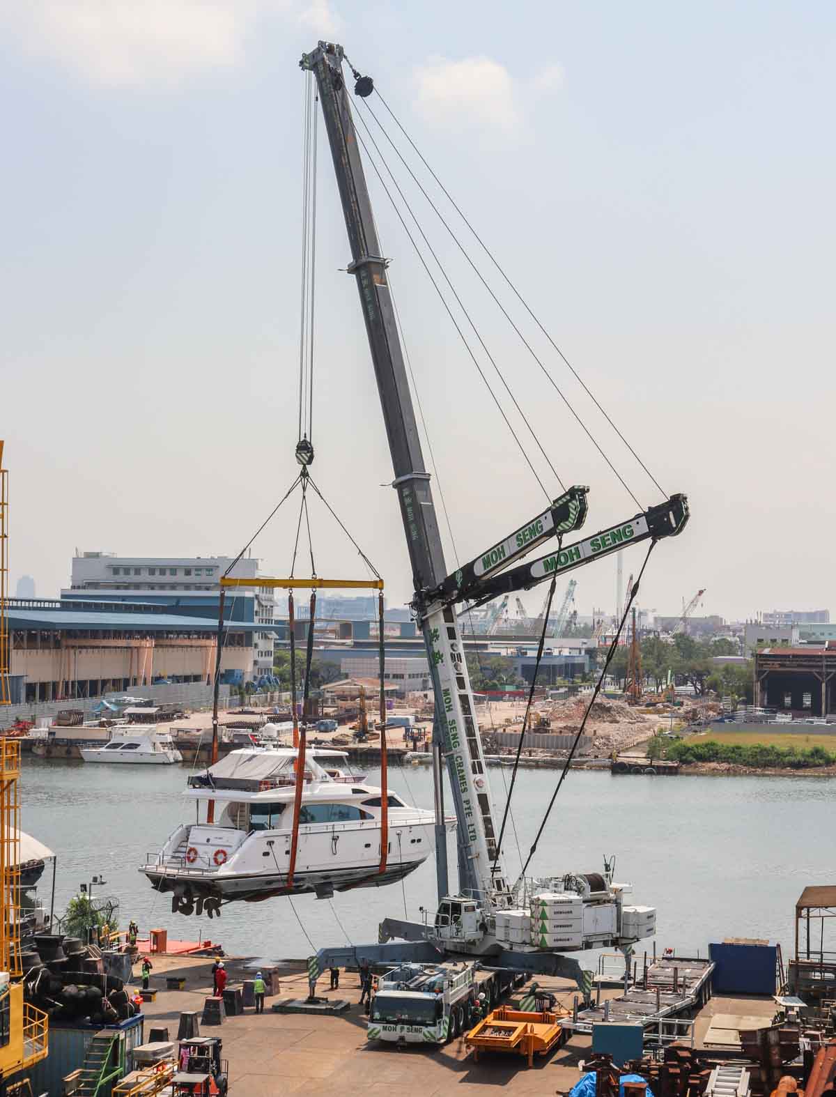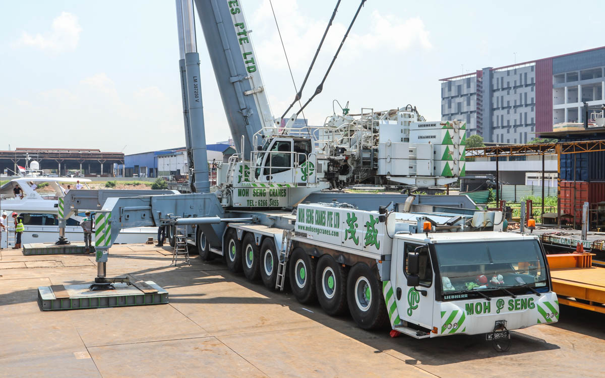 The impressive Liebherr LTM 1750-9.1 of Moh Seng from Singapore (SG) is shown here ready to lift a yacht out of the water.