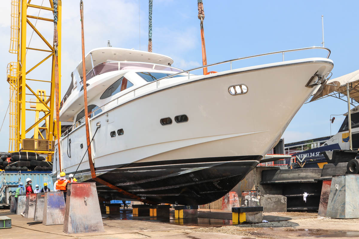 At a radius of approximately 18 metres, the yacht is placed onto the yard. Over the coming weeks the yacht will undergo full maintenance at this facility.