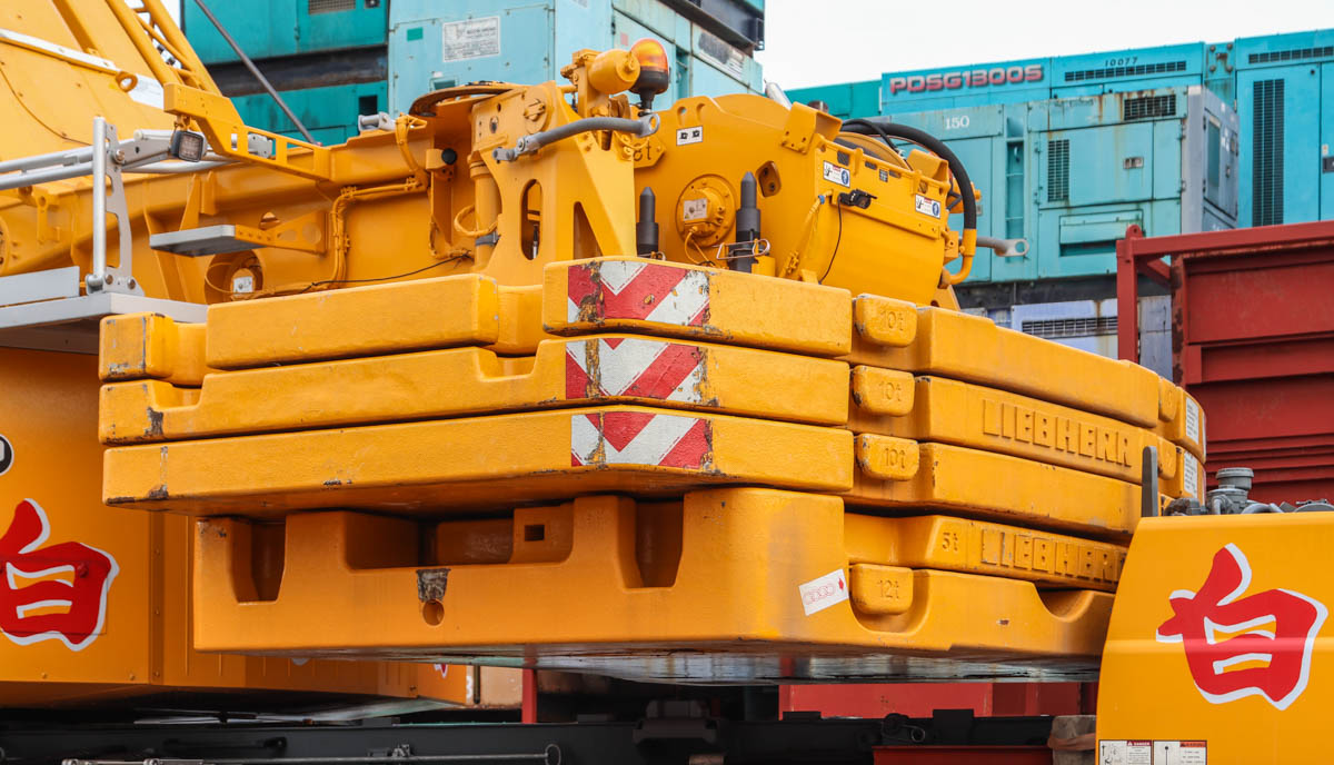 Here, the crane was operated with 47 tonnes of counterweight. The full counterweight weighs 72 tonnes. The counterweight can be mounted on the superstructure in two different positions, with a slewing radius of 4.83 meters or 5.73 meters. Here, the counterweight was positioned on the larger slewing radius.